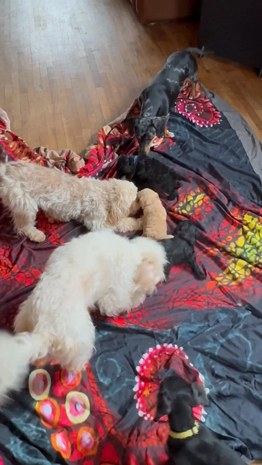 Hanging out with other pups, Sibling cuddles, and one on one snuggles. Great ways to socialize and train your pup to feel comfortable in different surroundings