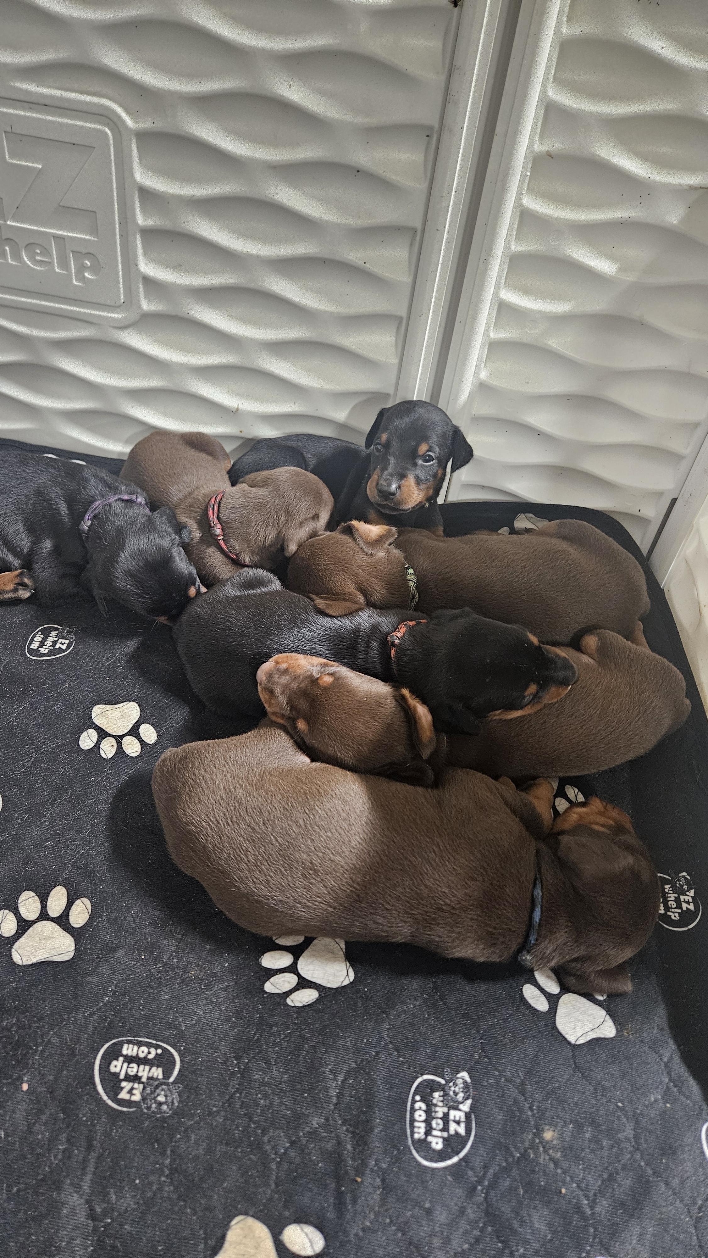 Our puppies include black and rust and red and rust. Colors will vary depending on the parent dogs.