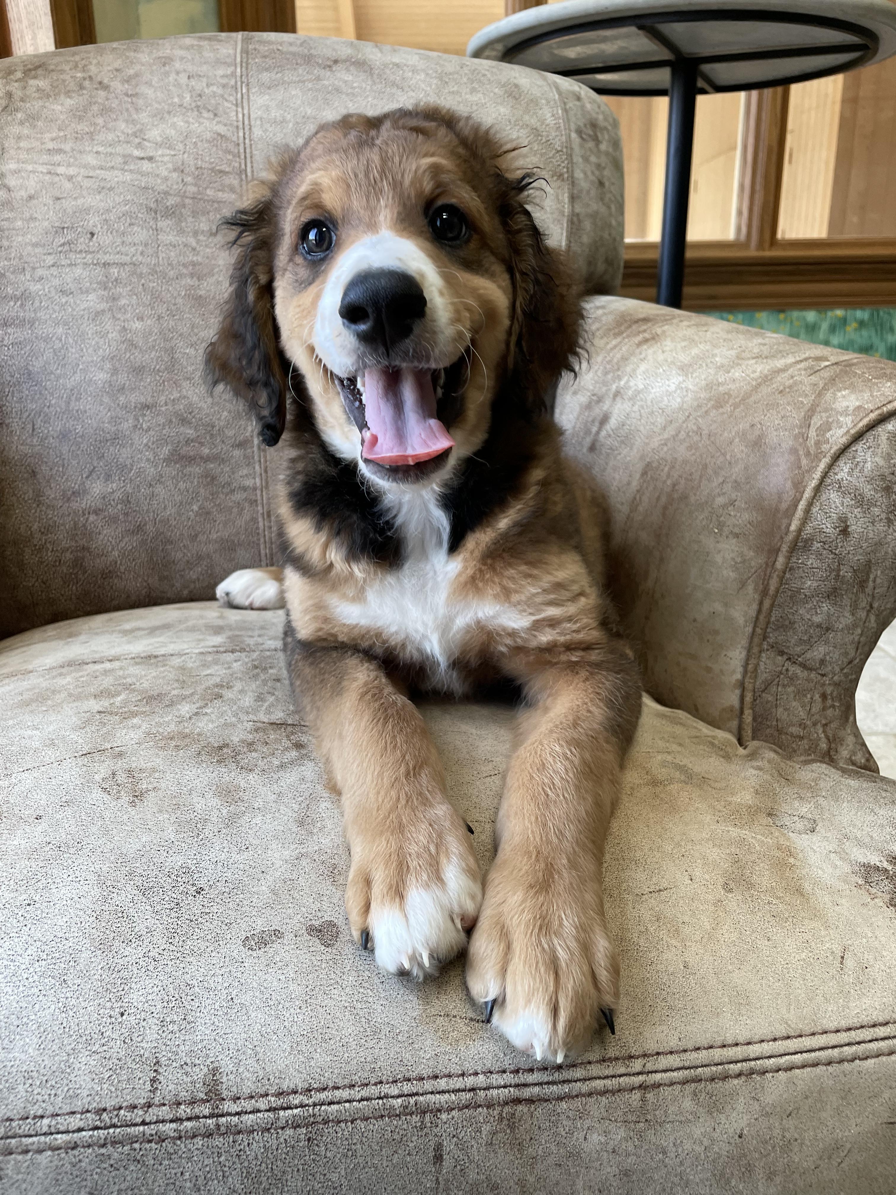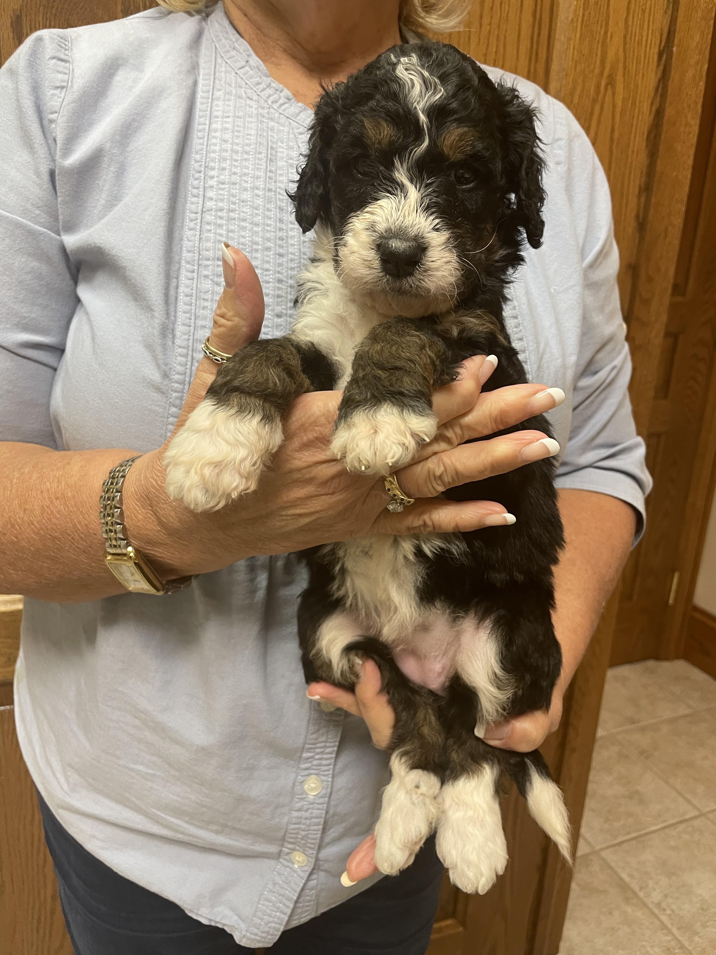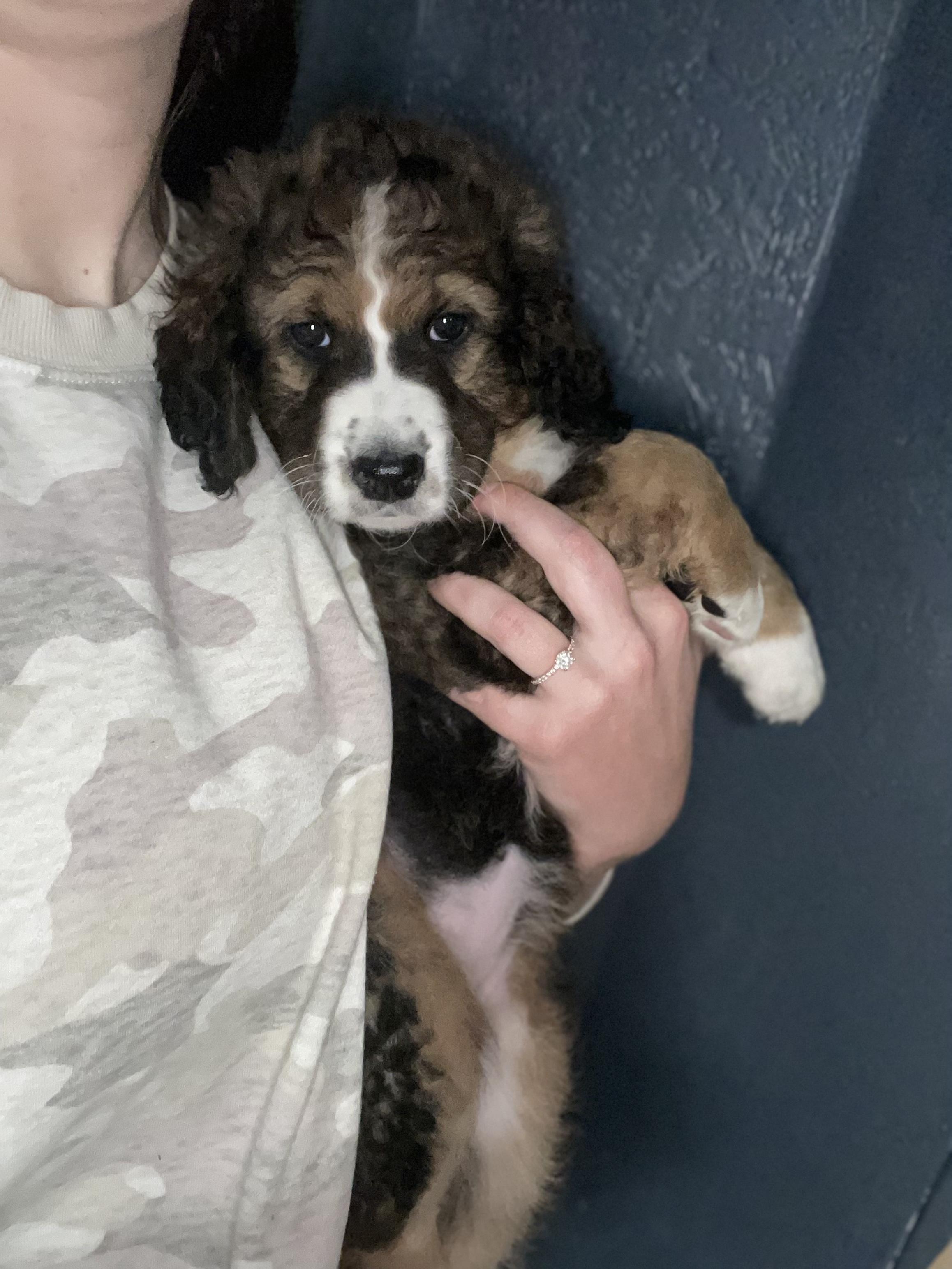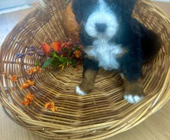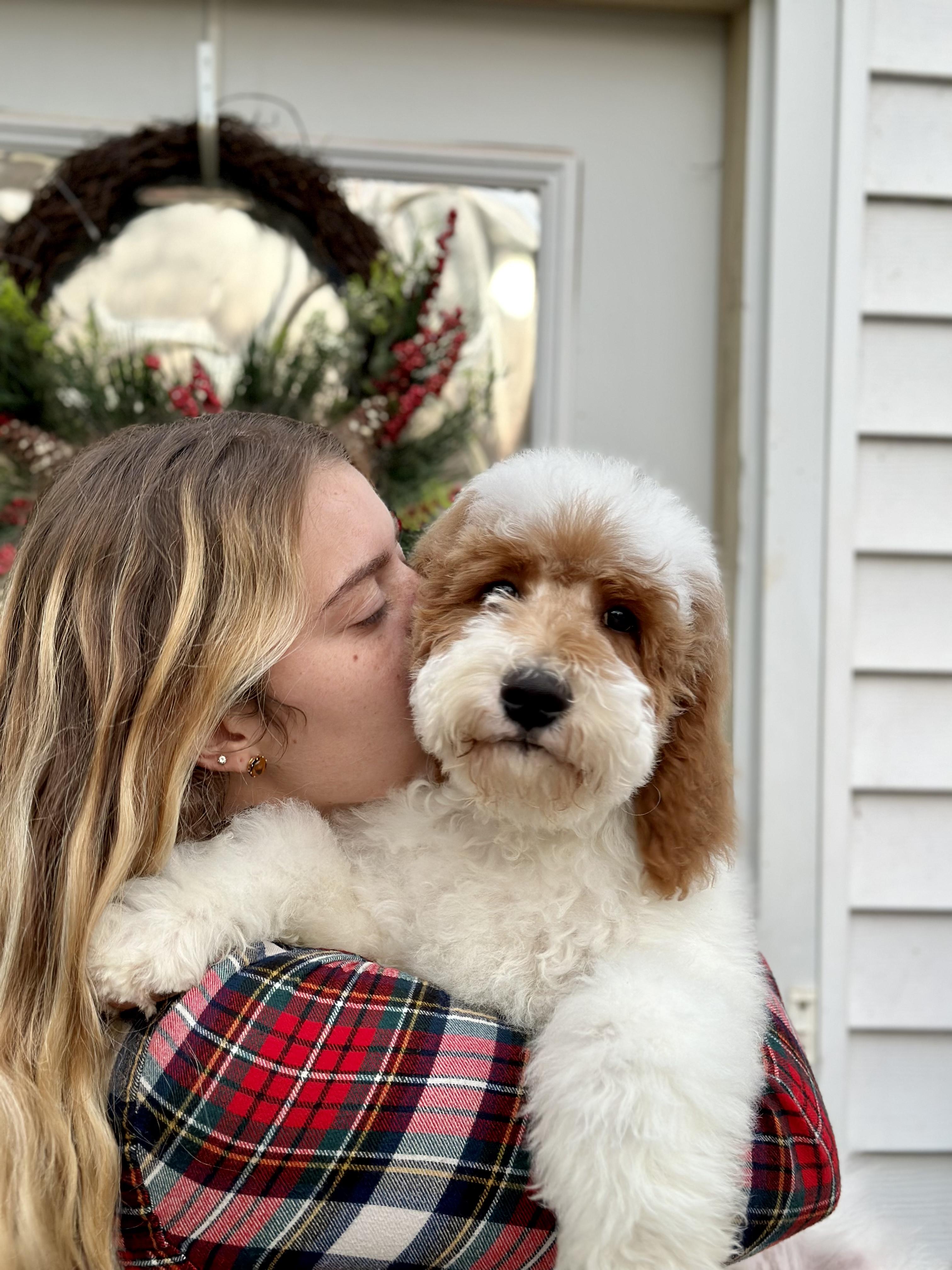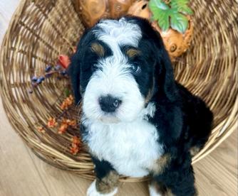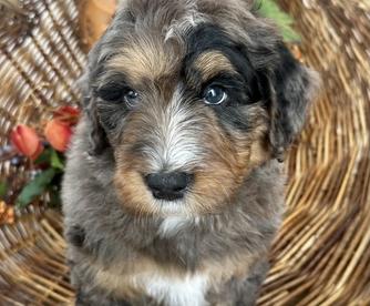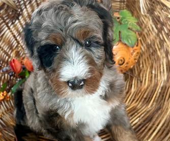 Our Goldendoodle puppies include apricot, red, and parti. Bernedoodle puppies include sable and black and white. Colors will vary depending on the parent dogs.