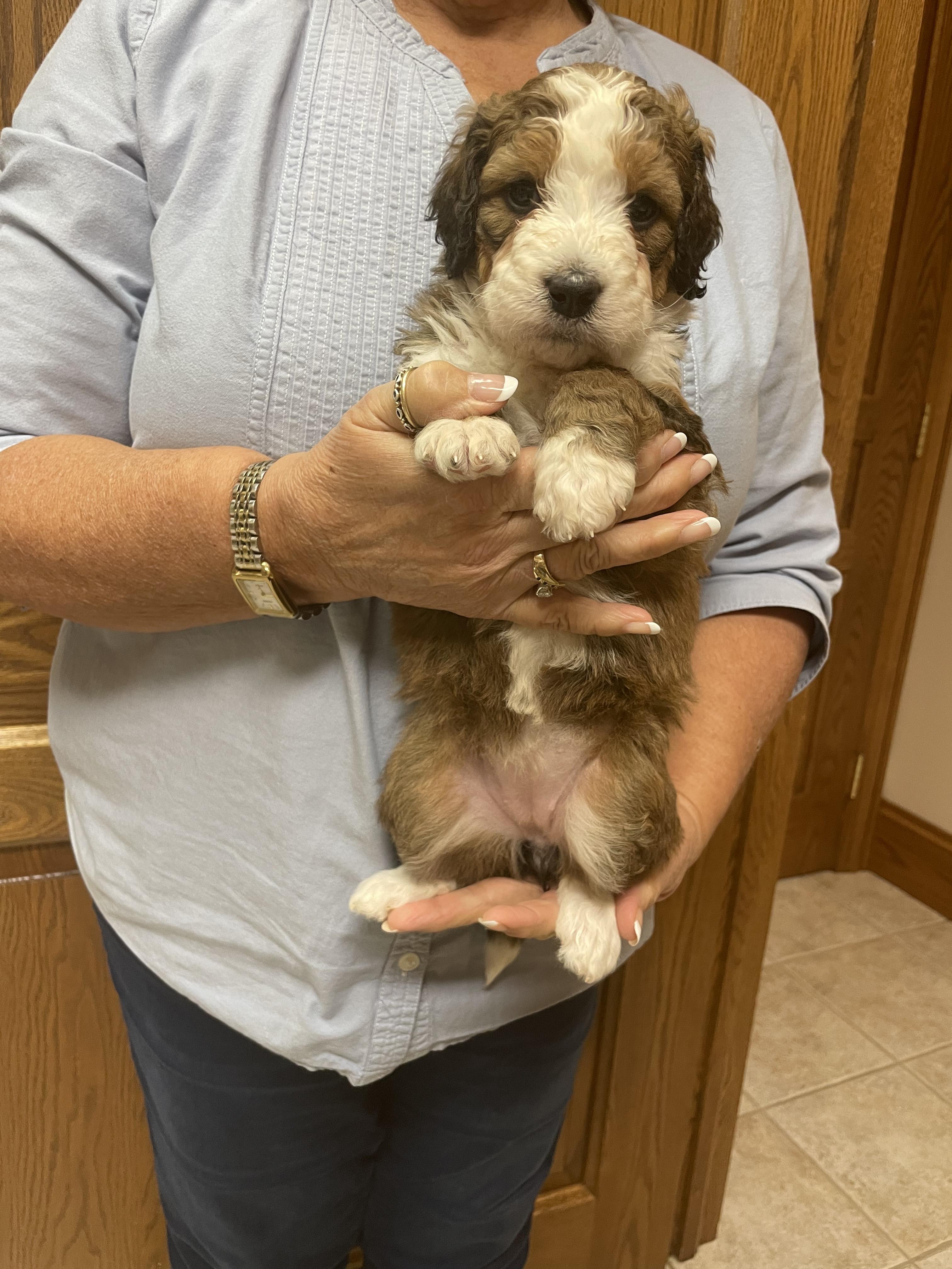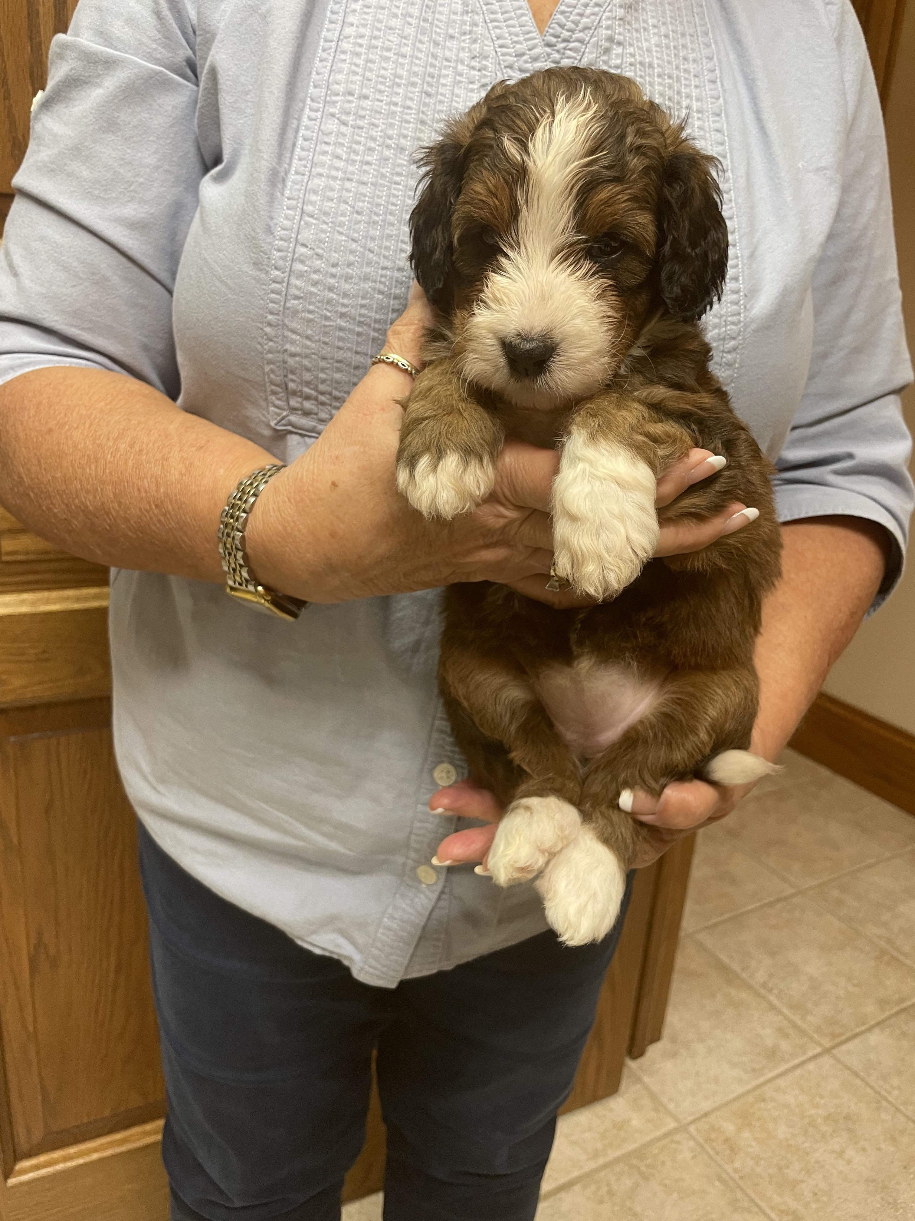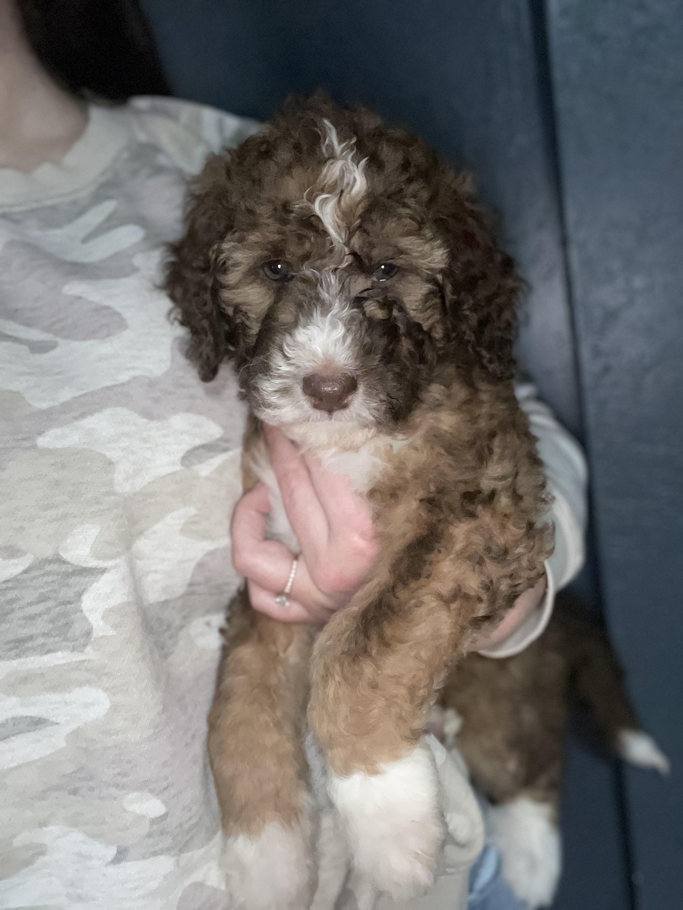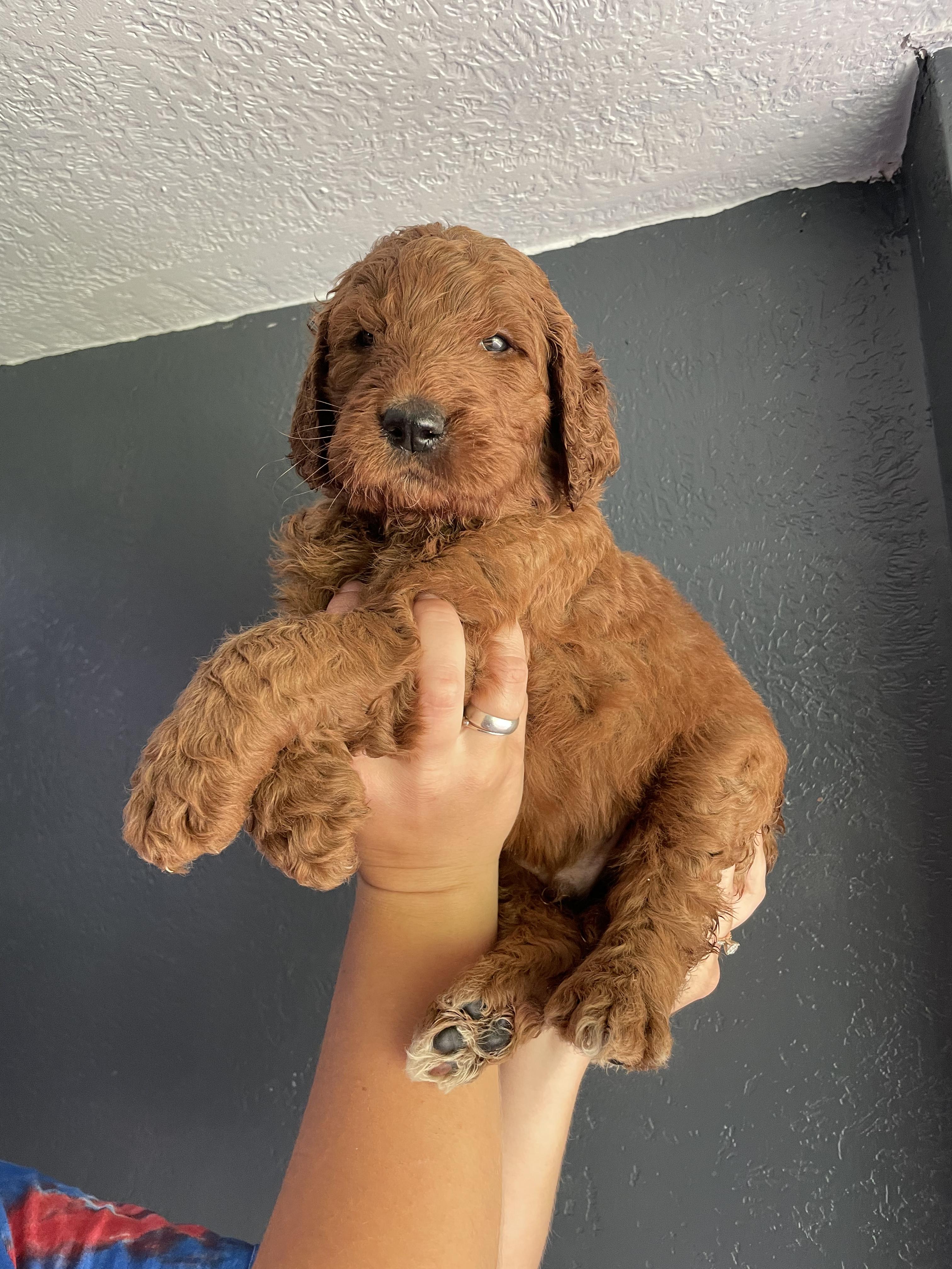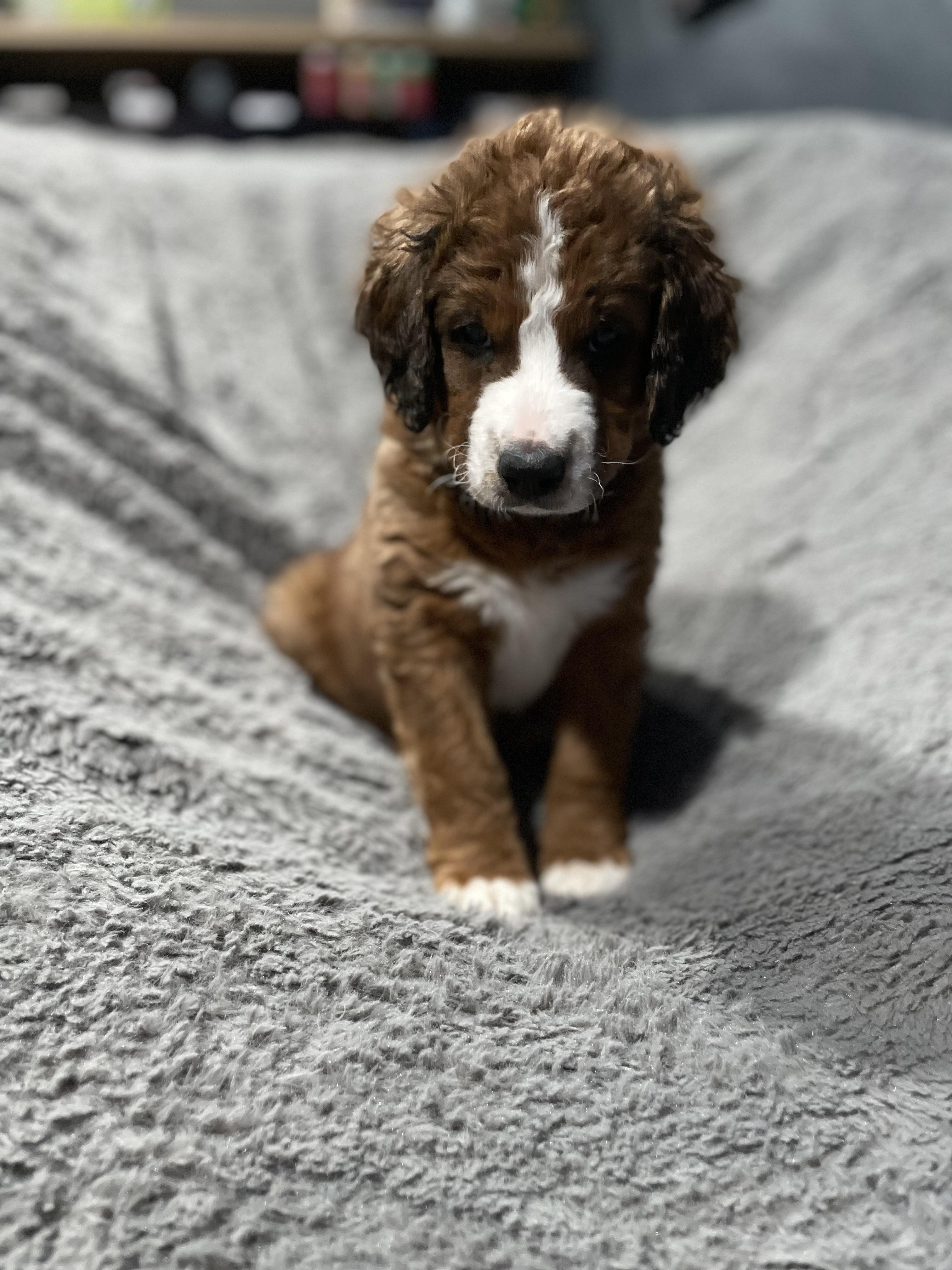 Our Goldendoodle puppies include apricot, red, and parti. Bernedoodle puppies include sable and black and white. Colors will vary depending on the parent dogs.