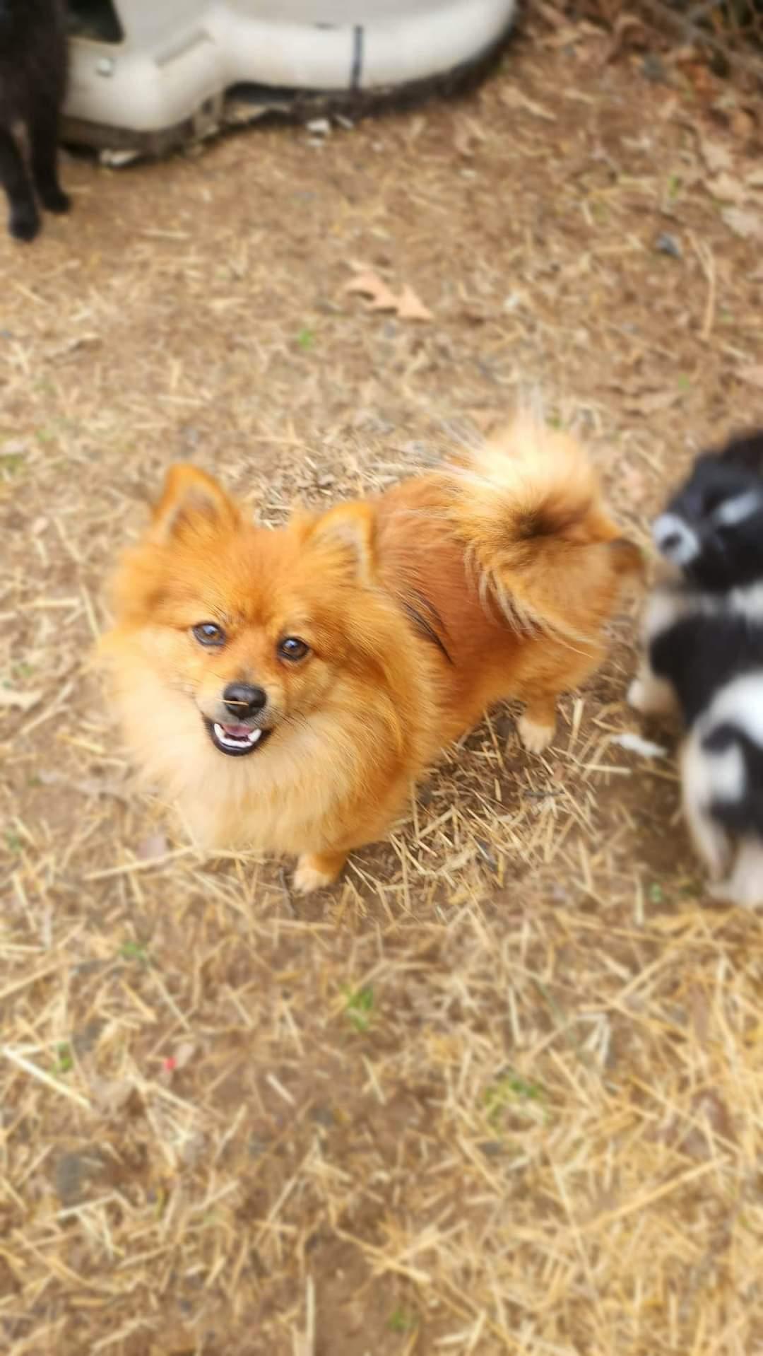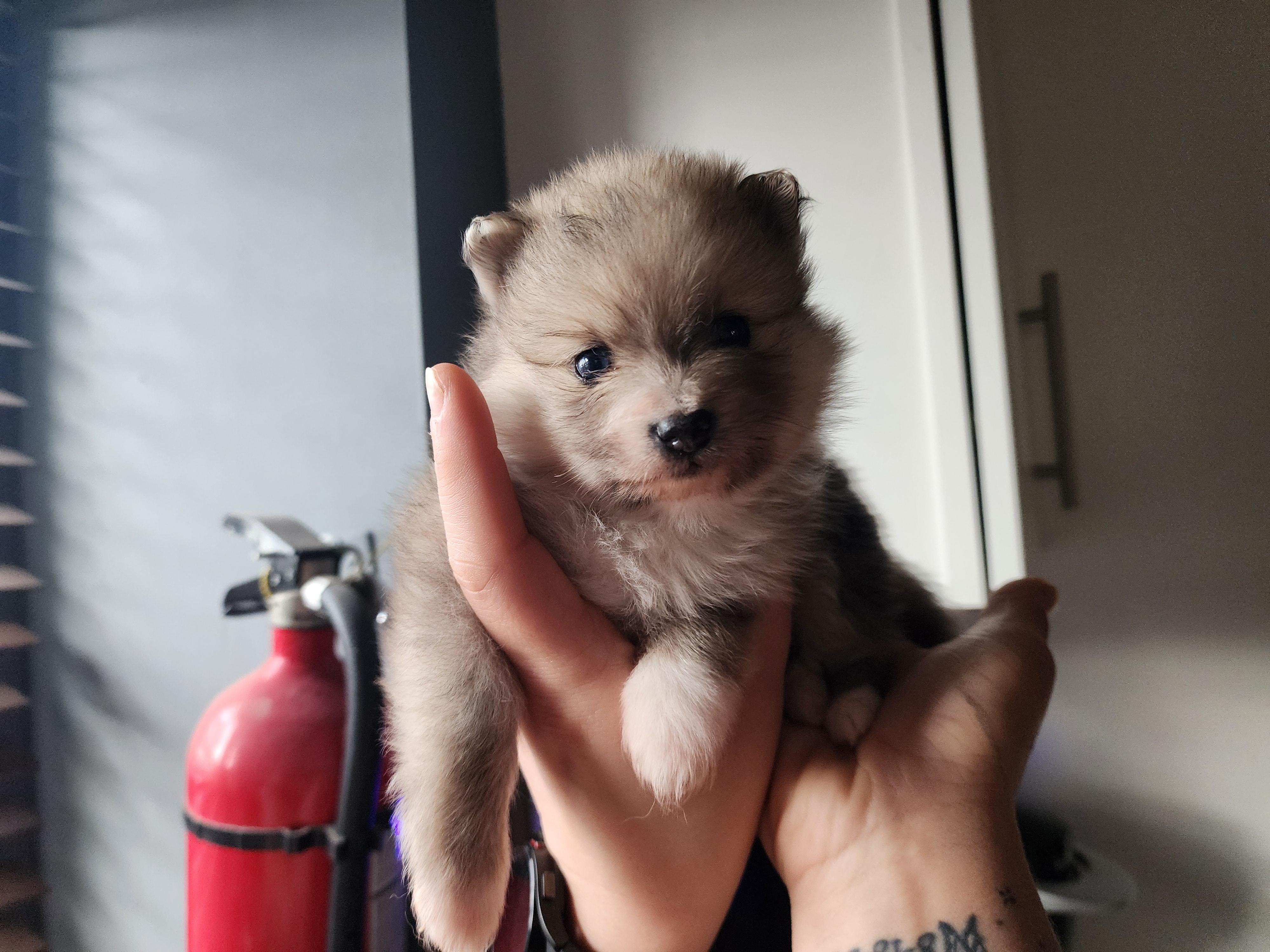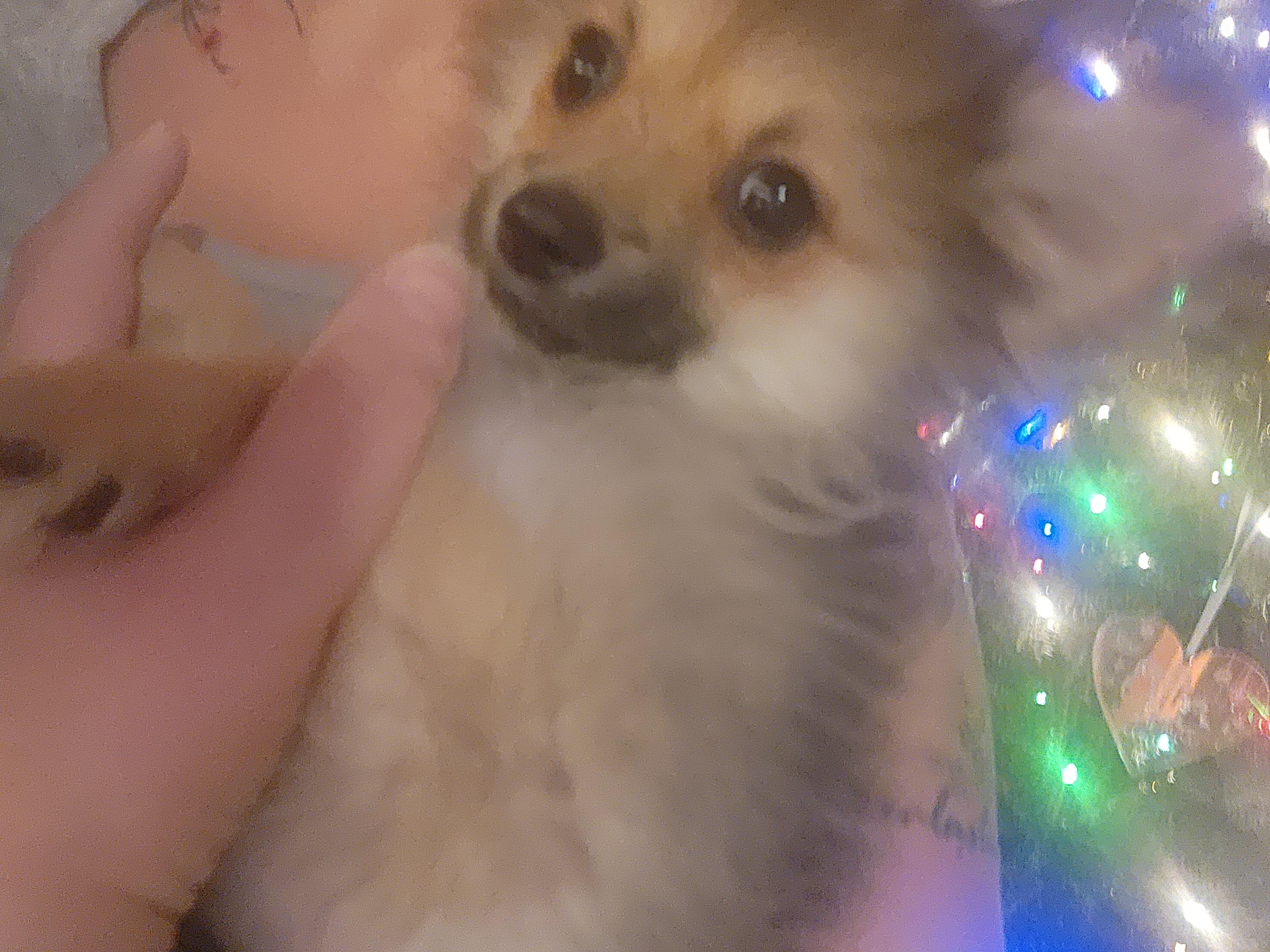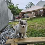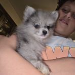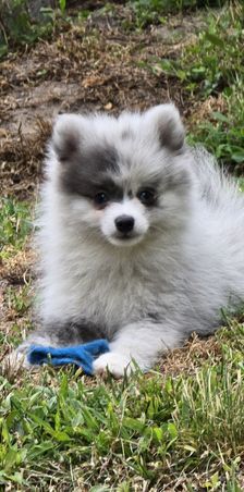 Blue pom with the cutest white toes and white chest, the biggest mush to ever exist. Blu is the most gentle dog to ever exist. He loves his family and shows it's with his snuggles as close as he can get in the nook of your neck!