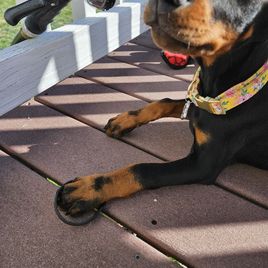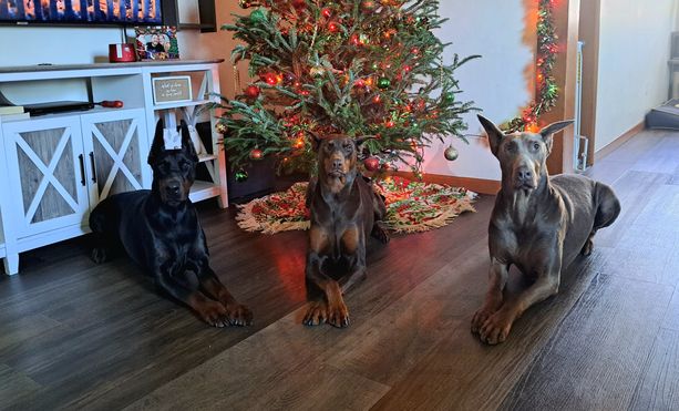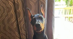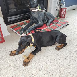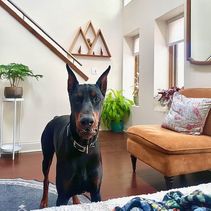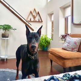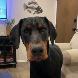 I had been in communication with Karen for a year or two before we got Bogey from her. She has always been incredible to work with - quick communication, knowledgeable, and helpful. We also have a female through a different breeder that was sired by Karen's Gordo. Both are the best dogs! Bogey is full euro and just over a year old. He's our fun-loving, fearless, snuggly boy. I don't have a single critical thing to say about my experience with Karen and KB's Dobermans. I highly recommend considering a dog from her program!