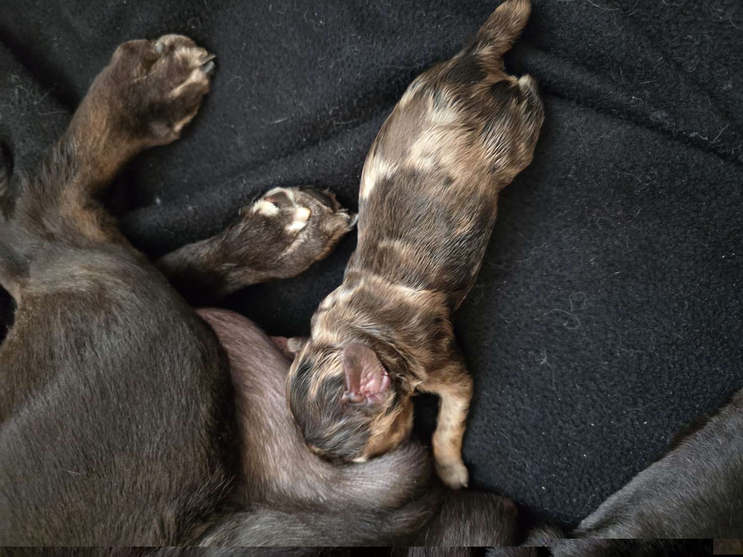 Our puppies include black, brown and tan, black and tan, red roan, and buff. Colors will vary depending on the parent dogs.