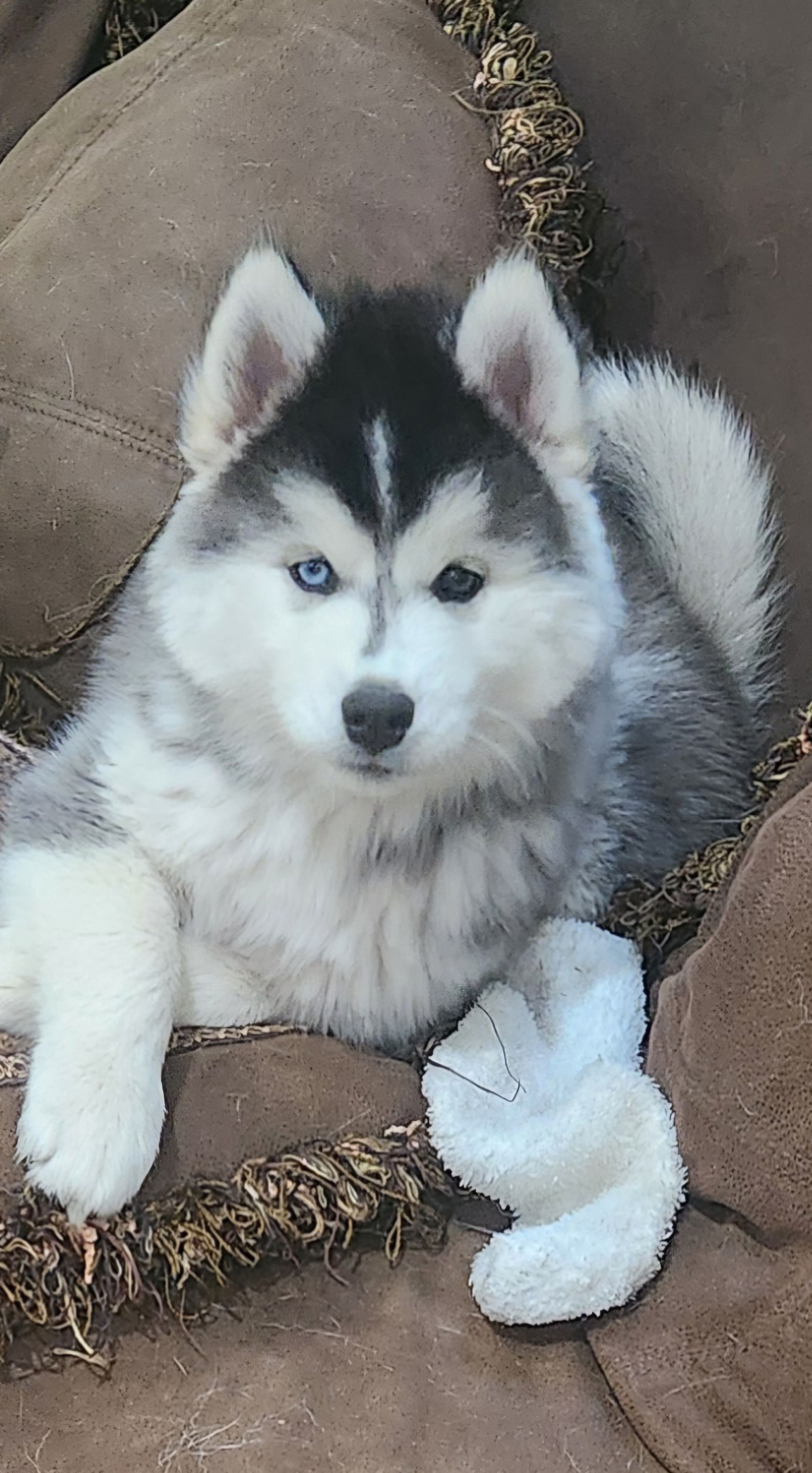 Mishka has a gentle nature but also a playful side. She lives going on walks, playing with her owners and sleeping under the bed.She is akc registeted and embark tested. She too has 1 blue and 1 brown eye