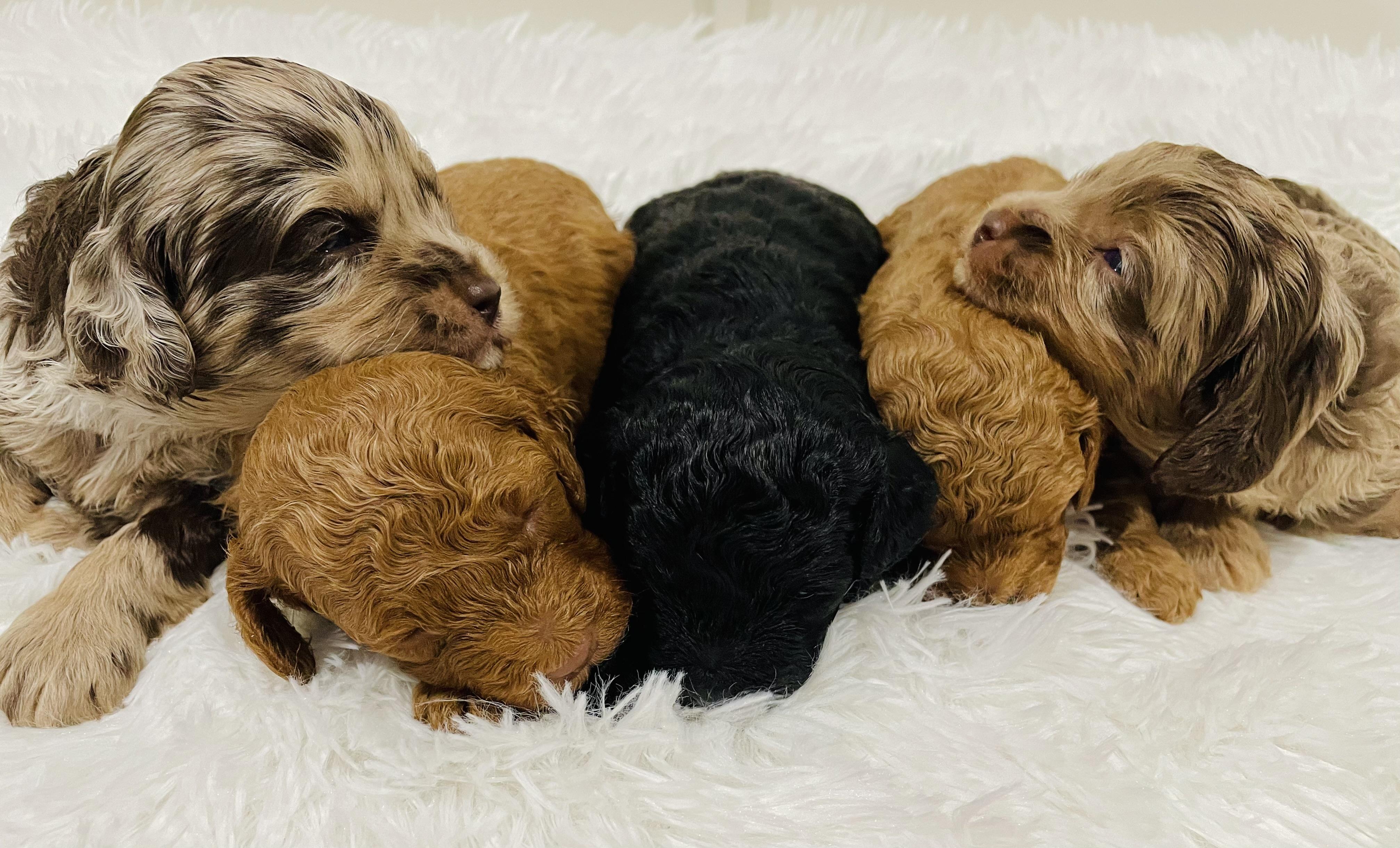 Our puppies include merle, cream, red, buff, and black. Colors will vary depending on the parent dogs.