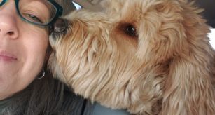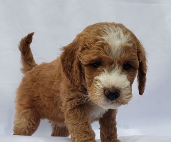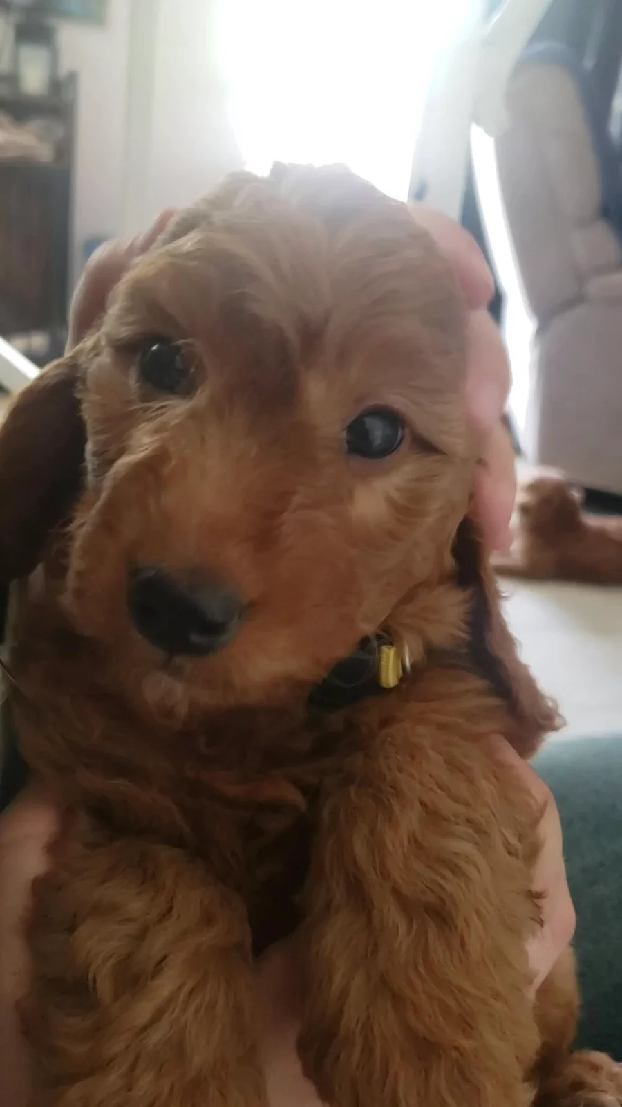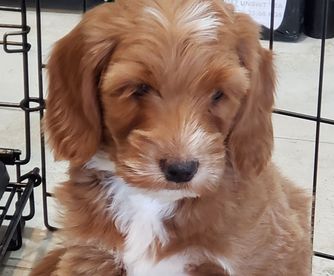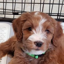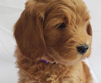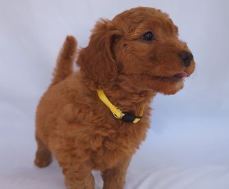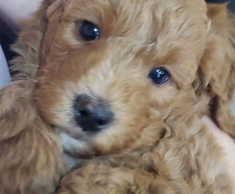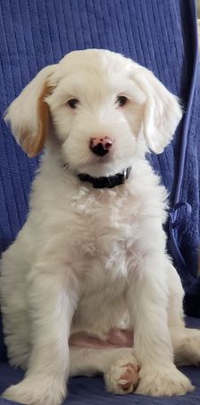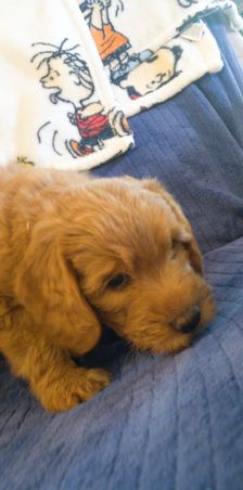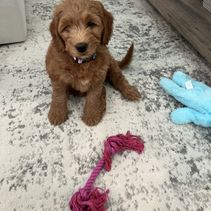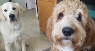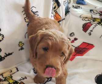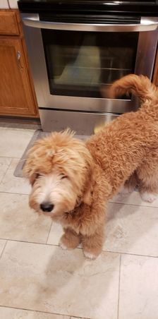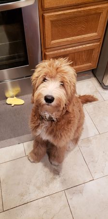 Hazel is an F1 beauty. Her mother is an AKC Golden Retriever who has produced a grand champion and her sire is an AKC Standard Poodle. Hazel is known for her very sweet affectionate personality. At 50 lbs, she still believes that she fits just fine on your lap! She was very easy to train and does great with all ages of children and other animals. She was tested for her overall health for each litter and her hips and elbows. This is her 3rd and final litter. She is a very attentive mother and spends a lot of time with her puppies.
