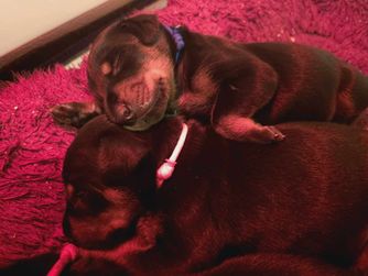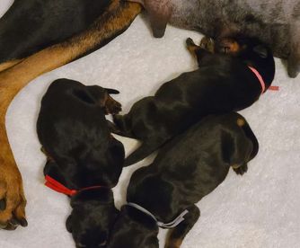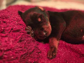 Our puppies include black and rust and red and rust. Colors will vary depending on the parent dogs.