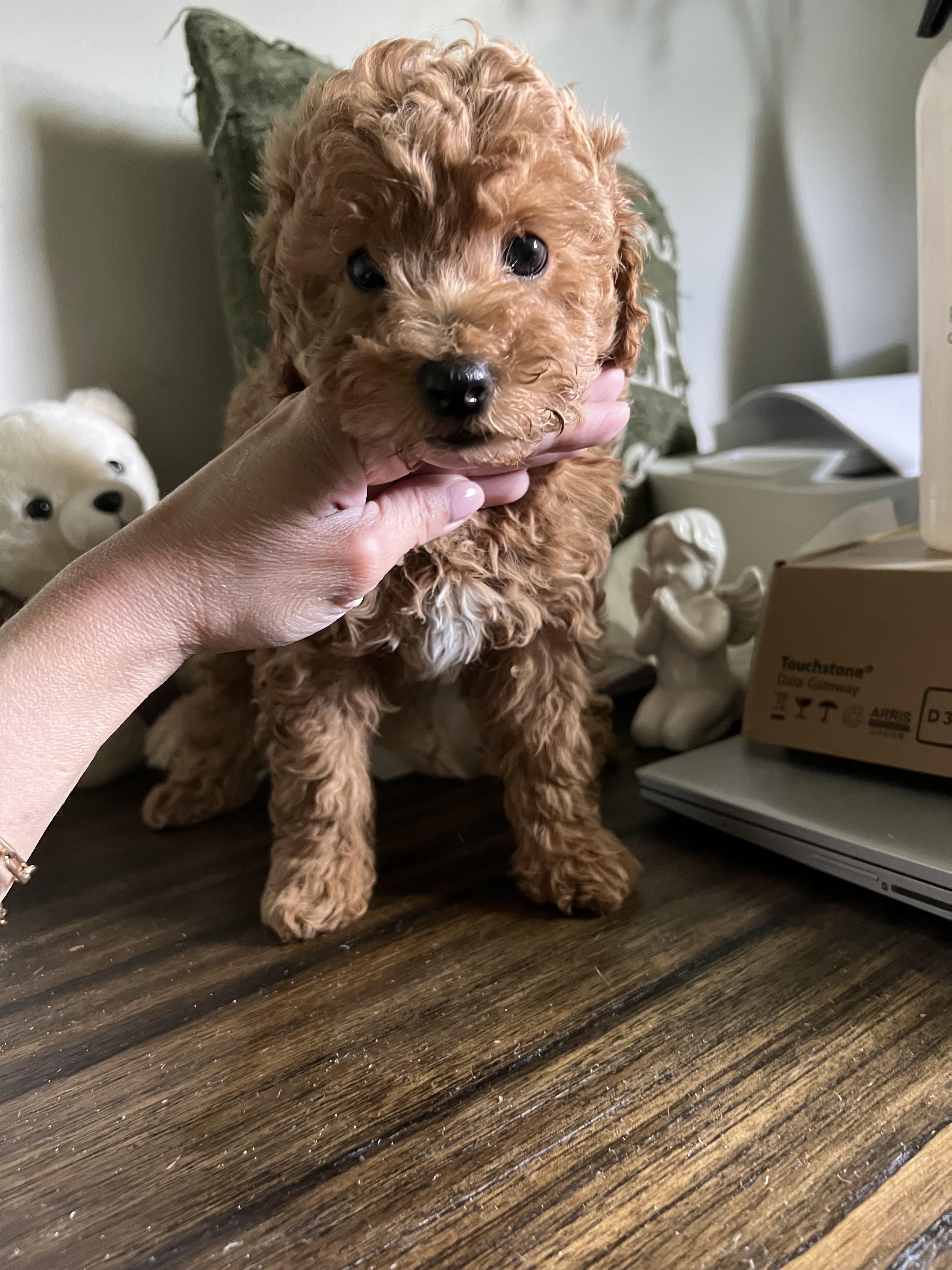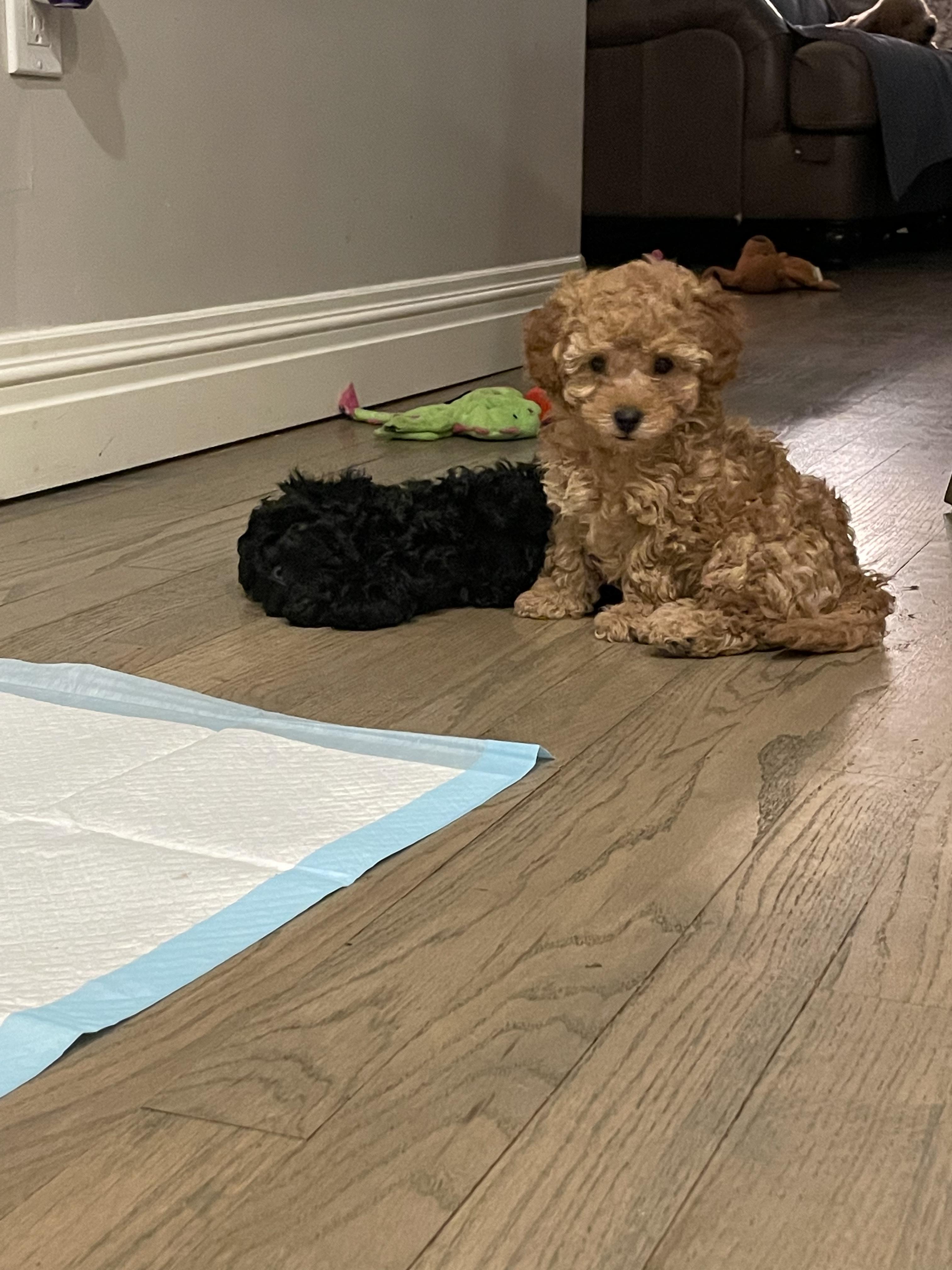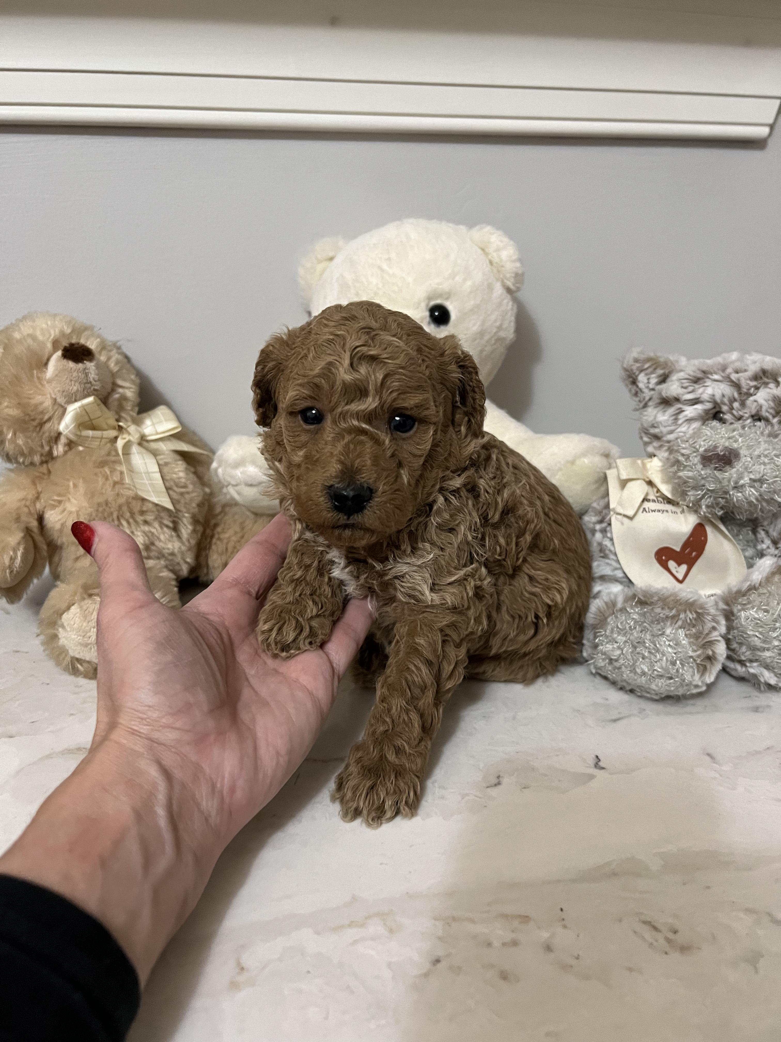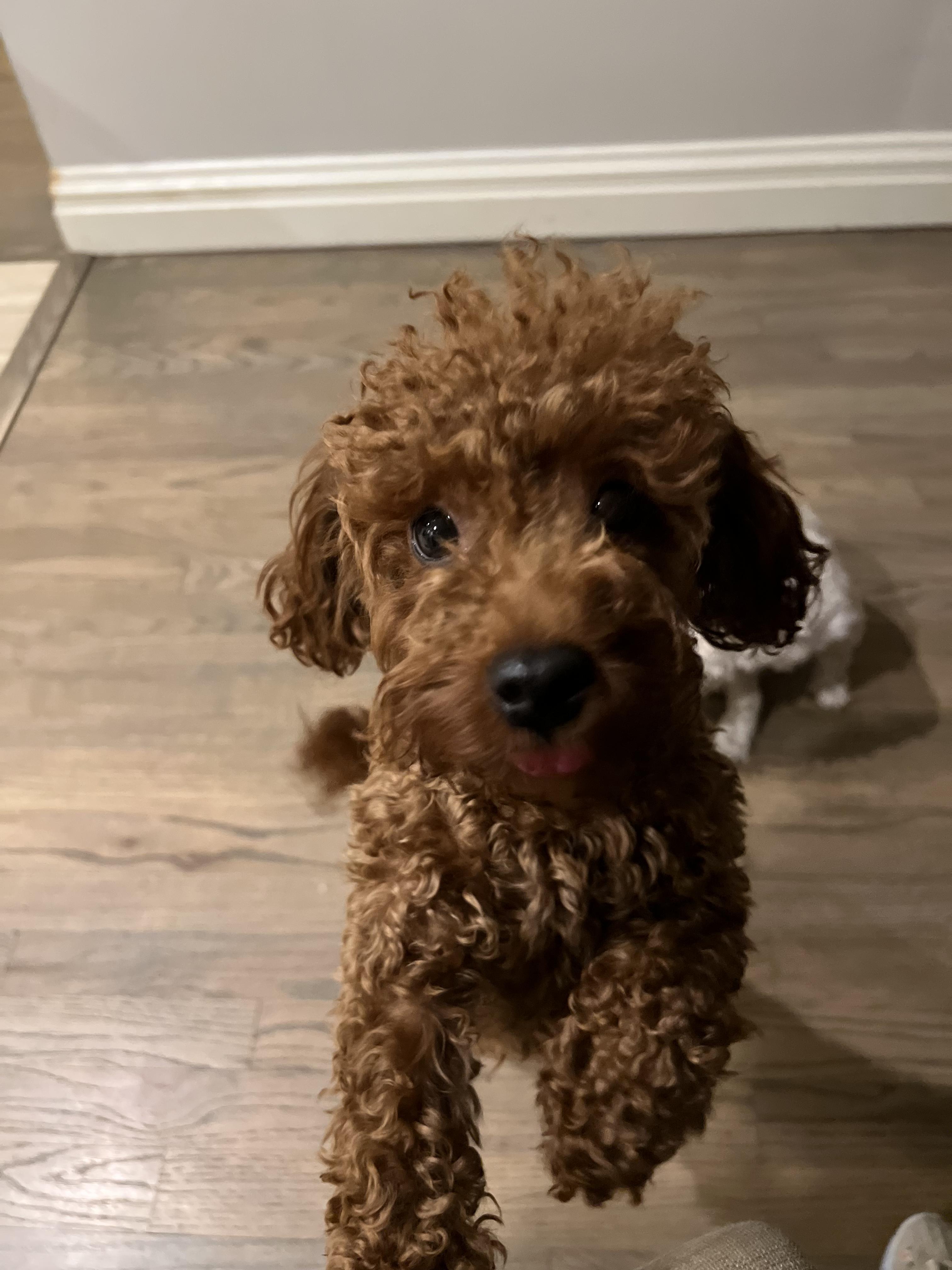 Meet Frodo our super cute stunning red poodle. He is very sweet love to snuggle mild tempered just like he’s dad yet loves to play, wrestle with hrs brothers and sister. Hes fully grown weight is expected to be between 8-10 lbs.