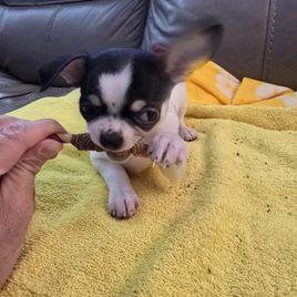 I contacted Kimberly in early March on a female Chihuahua puppy she had listed. At that time she informed me that she had just sold the puppy we were interested in. She then sent pictures of a new litter of pups with a beautiful white female. After seeing her and her parents we decided to place a deposit on her. This was before she had opened her eyes. Kimberly over the next seven weeks stayed in contact with us with pictures and videos of our Maddie. We finally met Kimberly on Saturday along with our beautiful little Maddie. Kimberly gave us a run down on Maddie and her vet visit we had our baby girl.