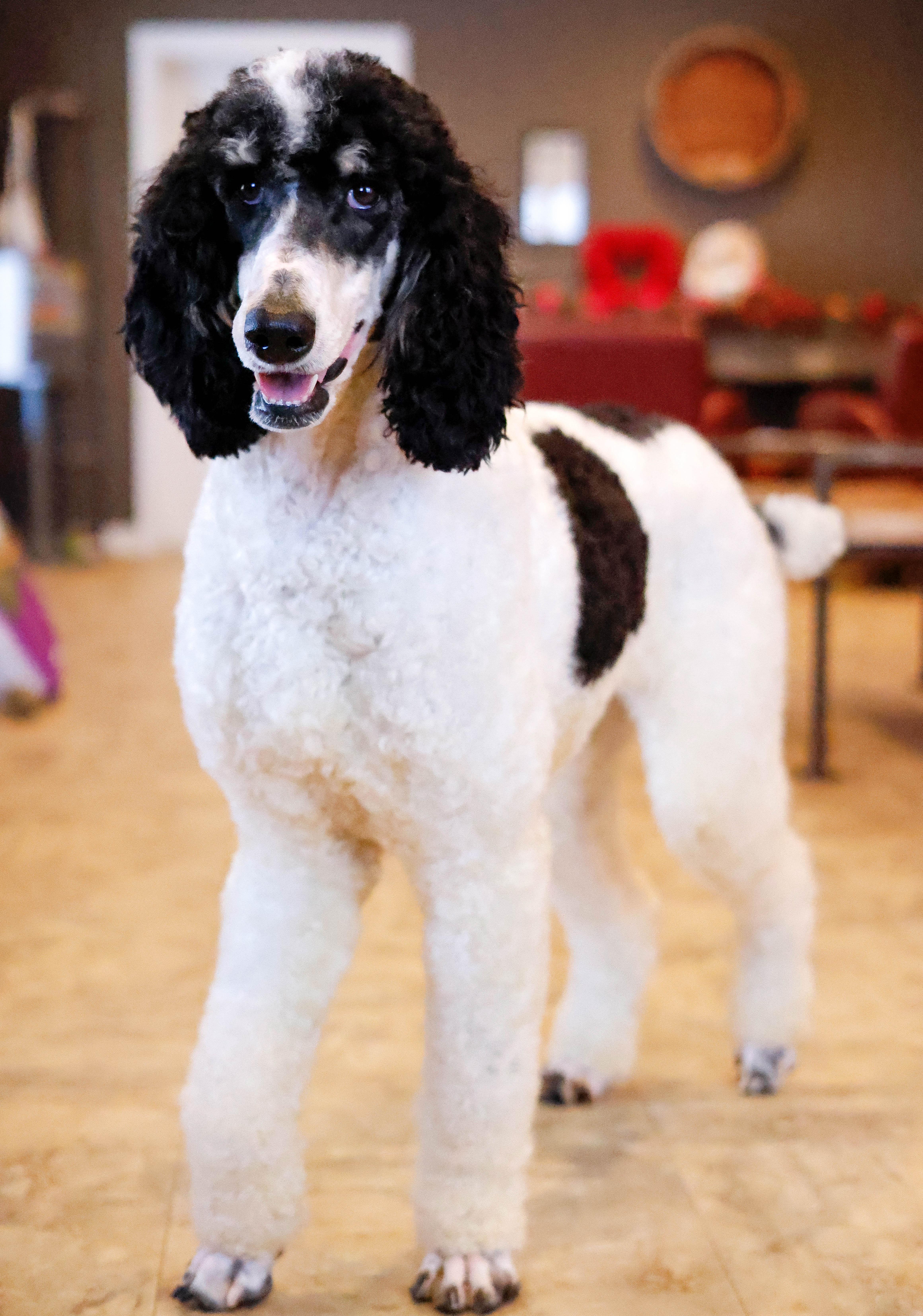 Zara is the perfect poodle from her genetics, disposition, and temperament. Zara is a gorgeous parti poodle featuring a silky soft curly coat. Miss Zara has a balanced mask which is highly sought after, a white tipped tail, and copper eyebrows. Her coat is snowy white with inky black markings. She has a tall and athletic square build. Zara is 57 pounds. Zara's temperament is perfection, she is friendly and social yet always respectful. She engages well and shows strong human attraction. She loves to interact and receive affection. Zara is intuitive and leans into your emotions. She knows exactly which mood you're in and always makes you smile. Zara is lower in energy for a poodle and is a sweet and sensitive girl. In the summer miss Zara enjoys quiet activities such as exploring the farm or playing with toys. In the colder months she enjoys to snuggle in with her fluffy blankets. Zara is well mannered and has a true polite demeanor. Zara is one of our top mothers as she is patient and so nurturing. Zara's puppies are always clean, well feed, and happy. She is the best momma and that shows in her puppies having outstanding demeanors. We had held back Zara's offspring for our own program as her puppies are high quality!