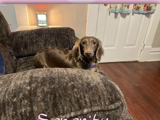 Serenity is a female Dachshund. Carefully selected as a great representative of her breed, Betty decided to make her part of their program. Betty has passed Good Dog’s screening process, which involved a review of their breeding practices, environment, and the mental and physical health of their dogs.