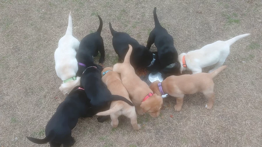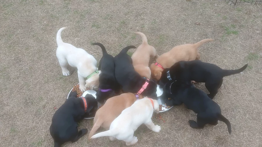 All puppies are doing well. They have started leash training. They are excellent with recall. Breakfast Bunch has also decreased to three meals a day which will be the consistent schedule until about 4 months of age. 👍🏼