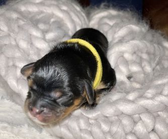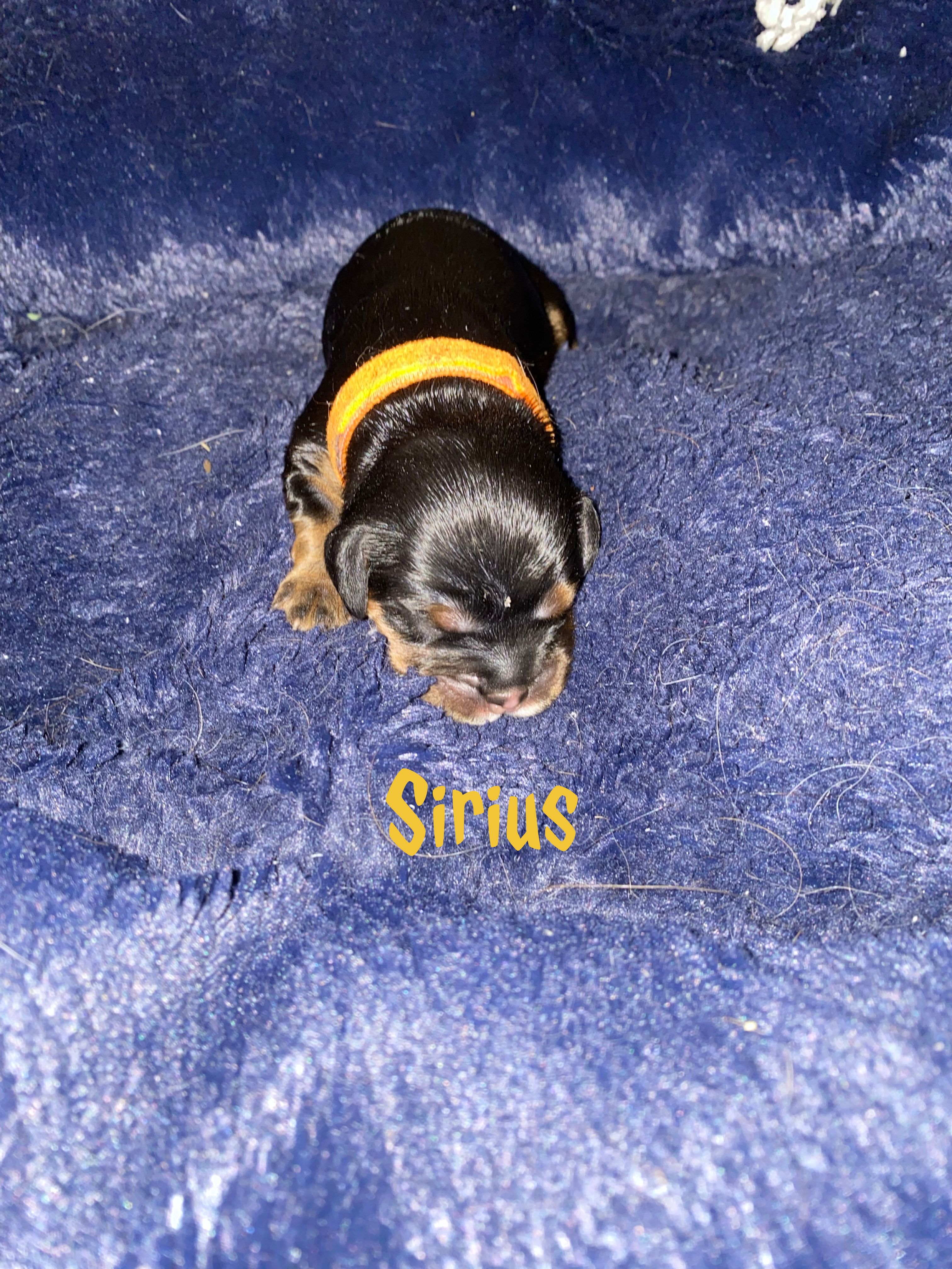 Tucker is Chocolate w/tan markings. His sire was a chocolate with tan marking and dam was a black & tan. All registered with AKC. He is such a sweetheart and all he wants to do is please you. When we get home he runs to get a toy to show us how cute he is.