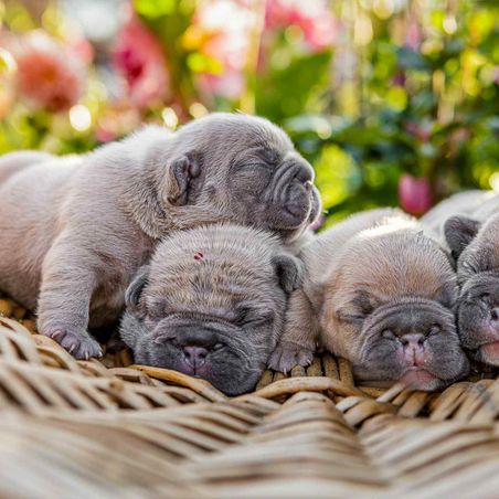 Our puppies include cream, white and black, liver, fawn and white, tricolors, blue fawn, and blue. Colors will vary depending on the parent dogs.
