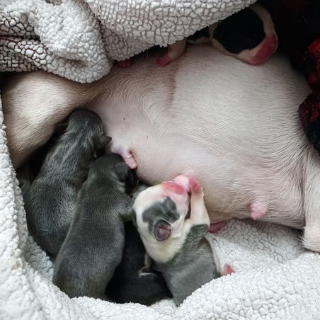 Our puppies include cream, fawn, white, fawn brindle and white, blue, liver, white and black, blue fawn, fawn and white, and black and white. Colors will vary depending on the parent dogs.
