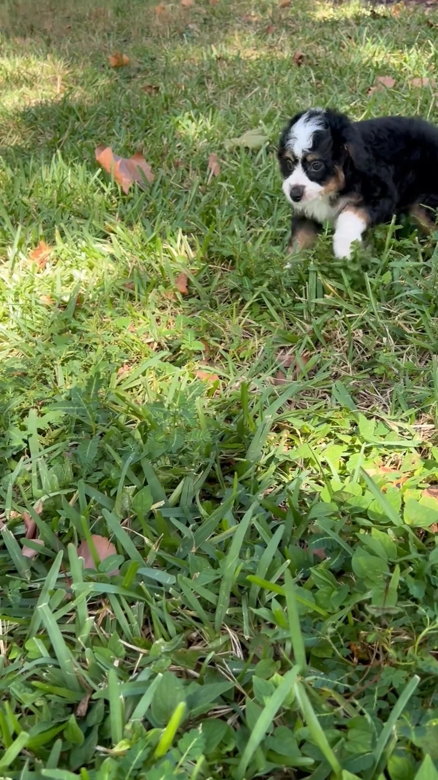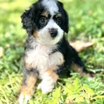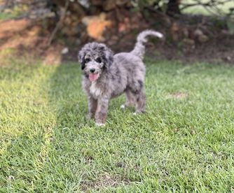 Raina is a F1 mini Bernedoodle she is tri color Merle with two blue eyes! She is loving and crazy smart!