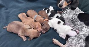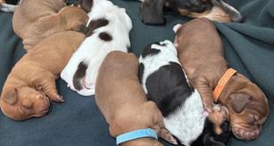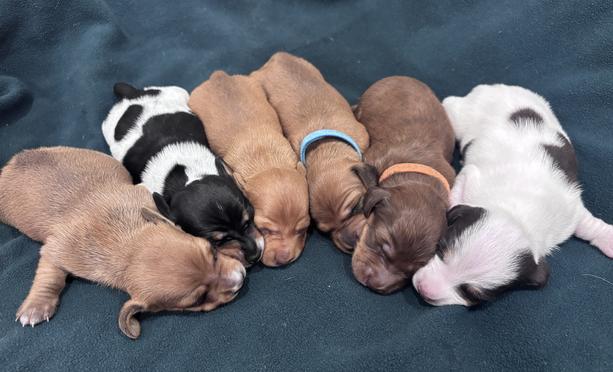 Our puppies include piebald, red, and chocolate and tan. Colors will vary depending on the parent dogs.