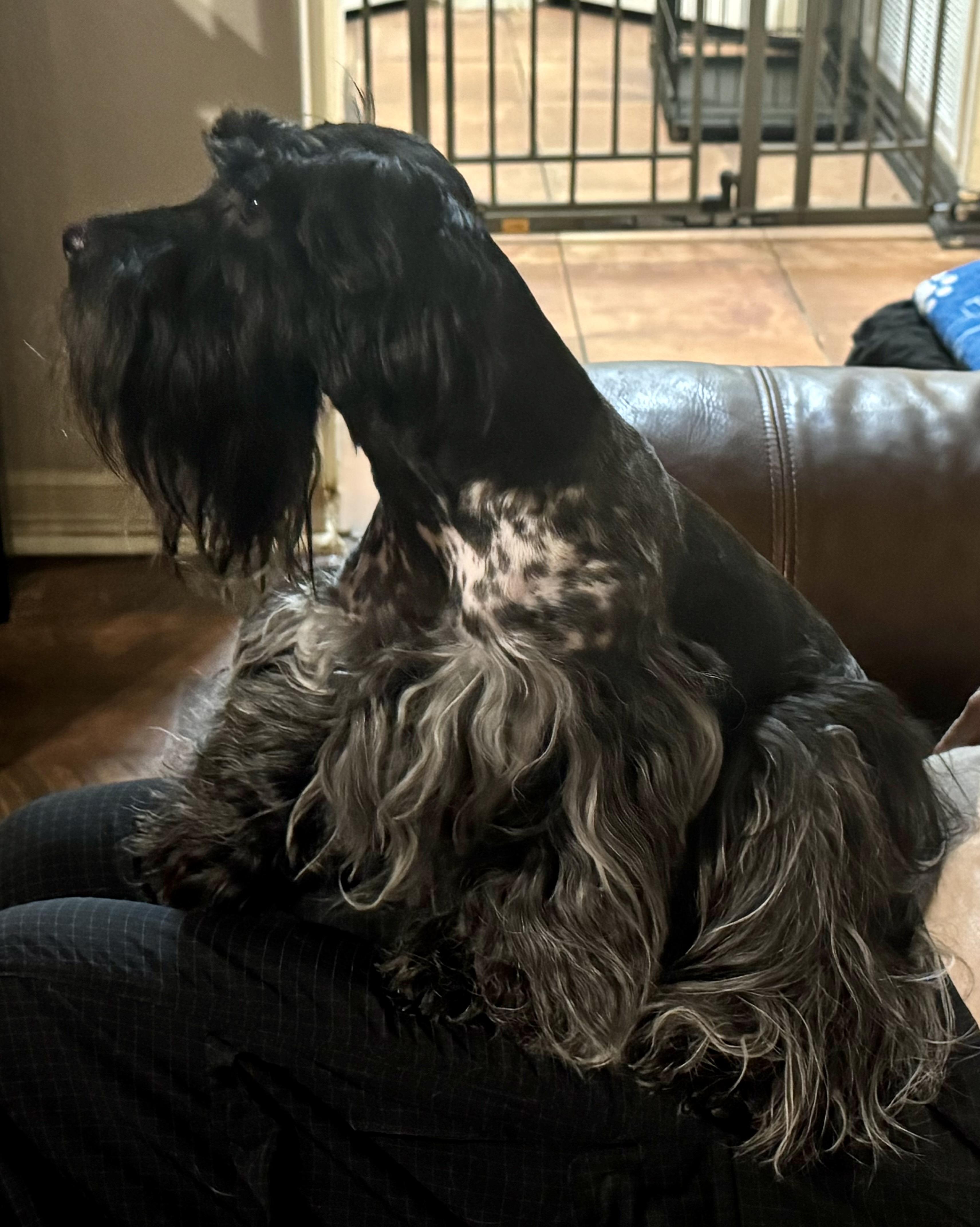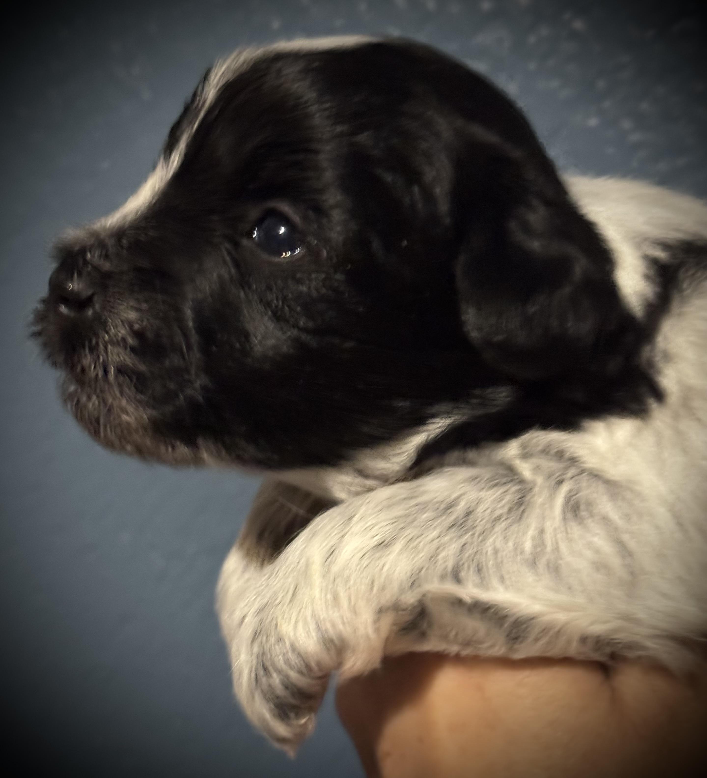 Rowen is an AKC black parti roan. His roan makes him a very flashy boy. He also has a very thick coat. Rowen is a really affectionate boy that has a lot of energy and loves to play fetch. He also enjoys cuddles at night.