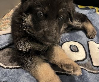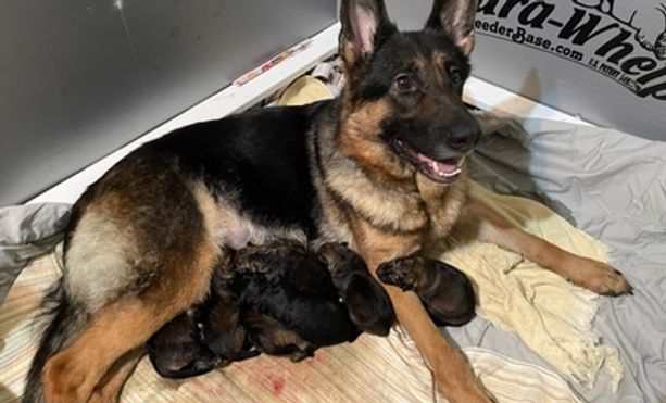 She is a direct import out of Germany, she came to us at 4 months old. Big boned, beautiful and gentle with children and adults. She is registered AKC and has all the import papers from Germany. This is her first litter.