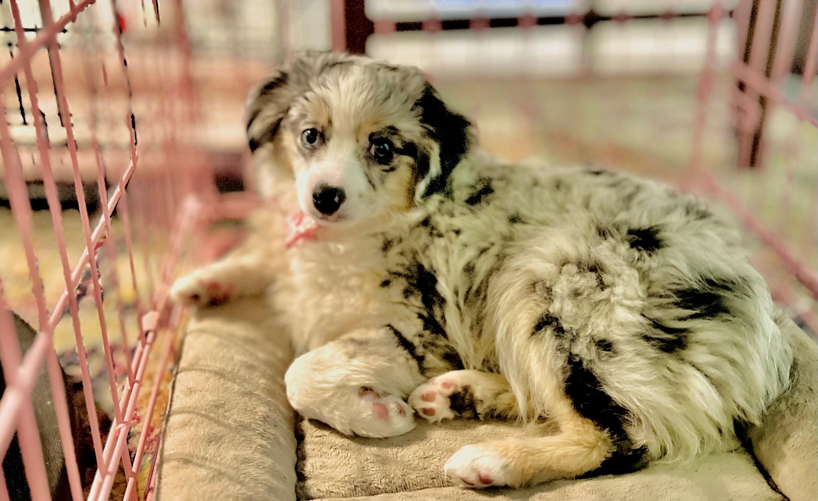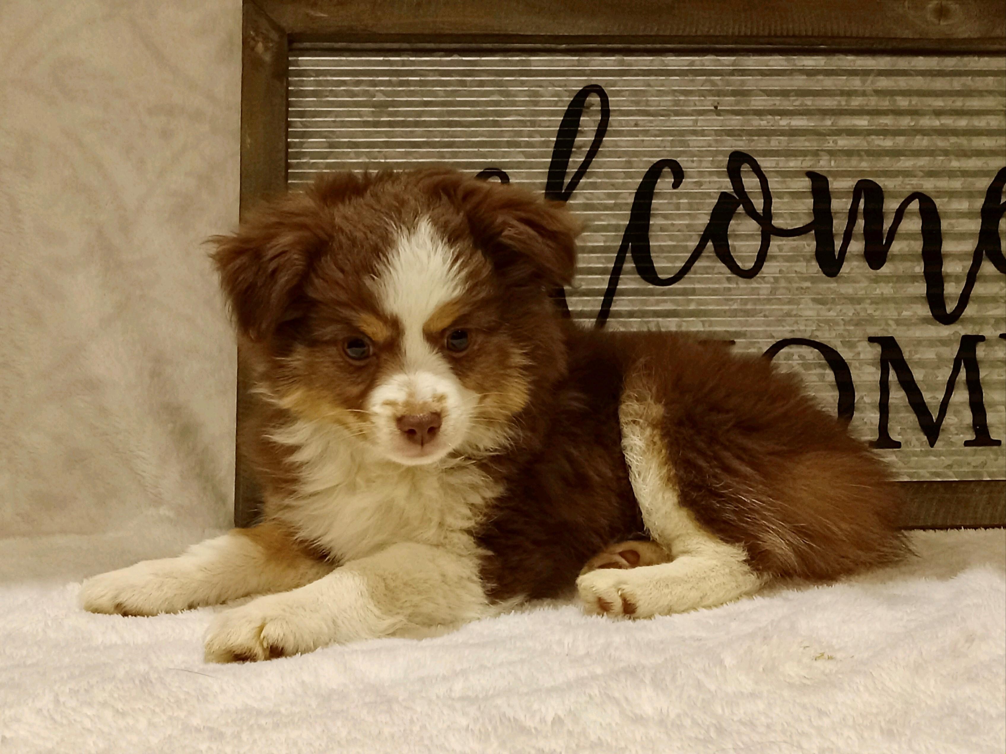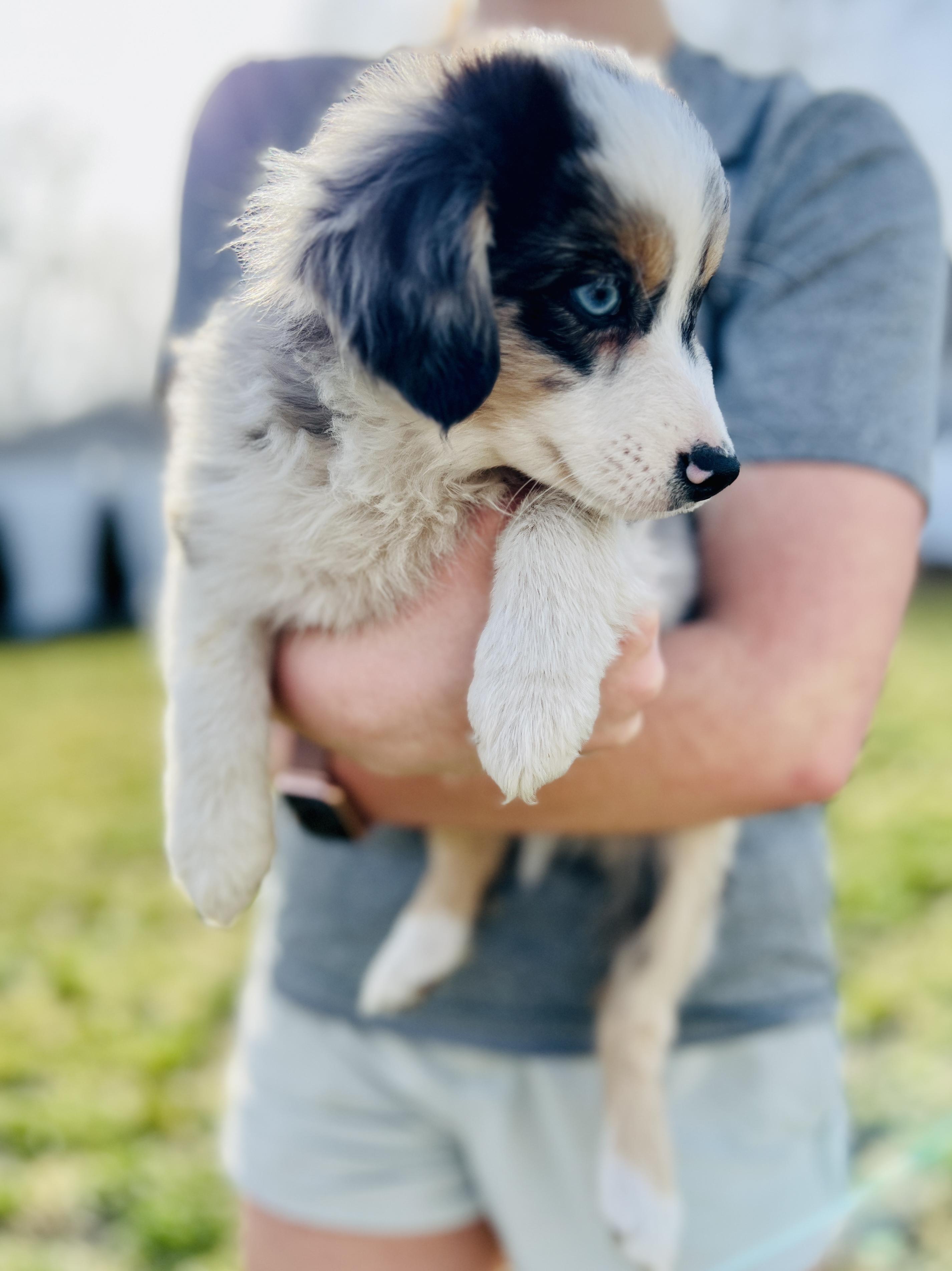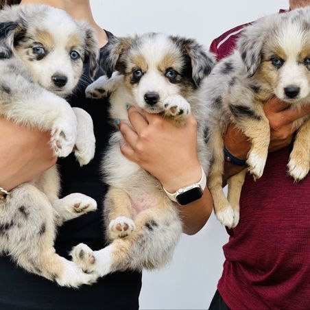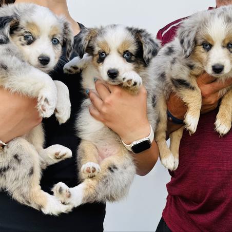 Our puppies include black tri, blue merle, red merle, and red tri. Colors will vary depending on the parent dogs.