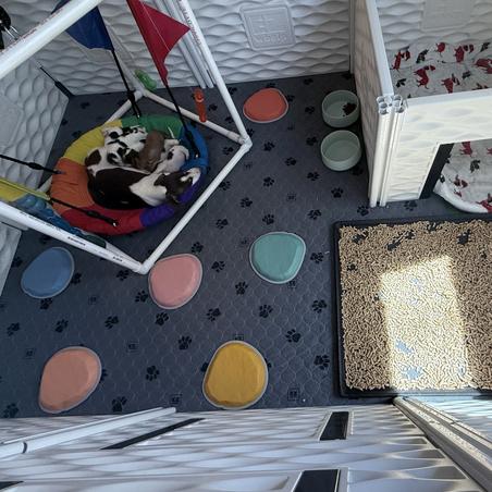 All of our litters are raised doing ens, around kids, other dogs big and small. I am home 24/7 so they’ll always have support. We do many many things to stimulate their brain and body.
