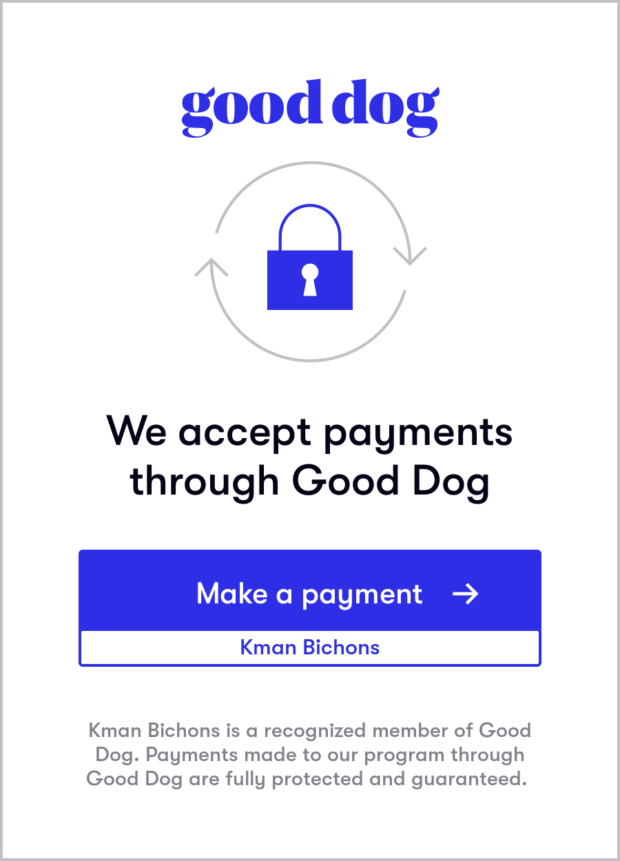 Kathleen has been certified by Good Dog’s screening team for responsible and trusted breeding practices. When you’re ready to reach out, feel free to ask any questions about the breed, their program, or specific puppies.