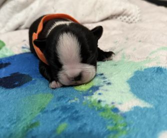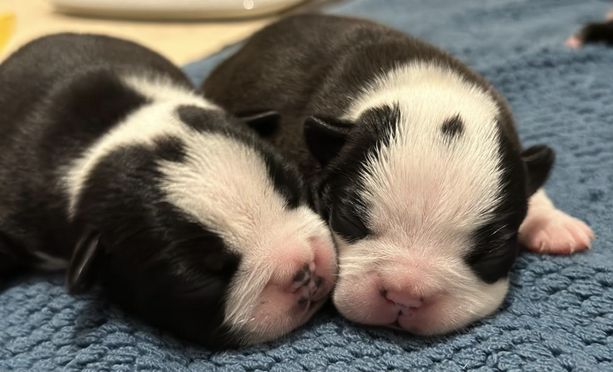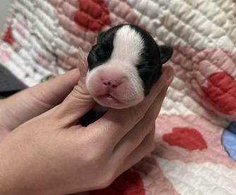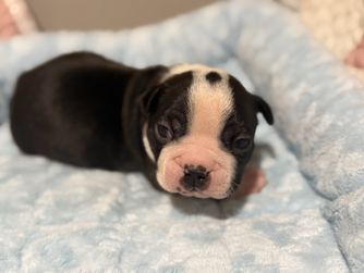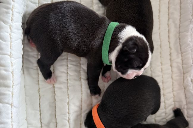 Our puppies include seal brindle and white, seal and white, brindle and white, black brindle and white, and black and white. Colors will vary depending on the parent dogs.