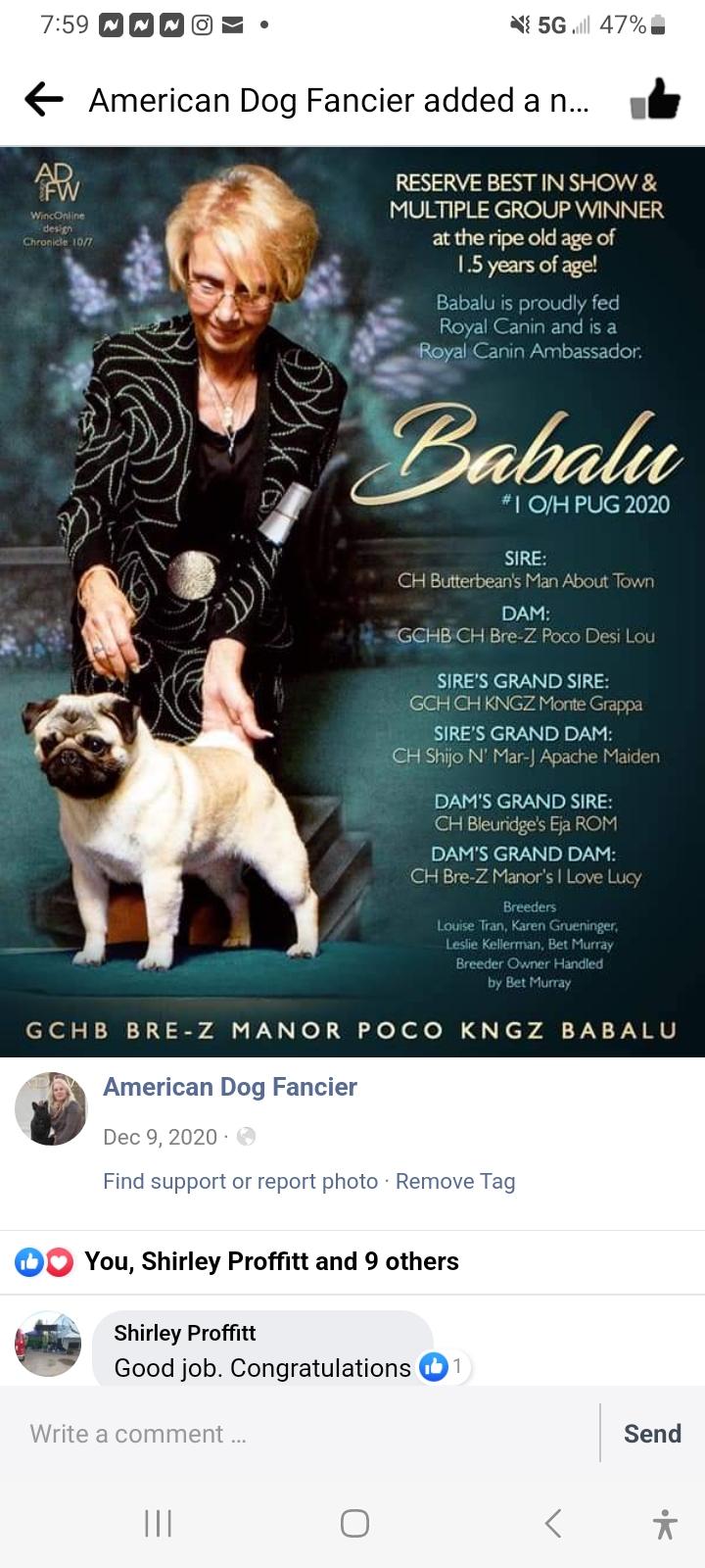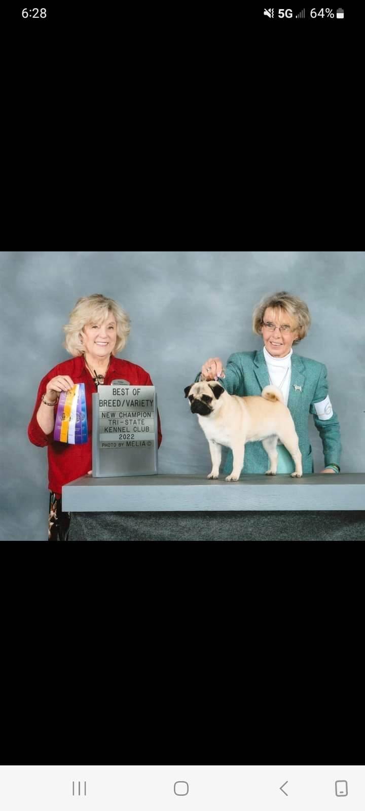 I regularly participate in conformation shows and started breeding to continue and improve upon my prized Pug line. It is an honor to represent this breed and create opportunities for others to experience the same joy that I've found in raising these wonderful dogs.