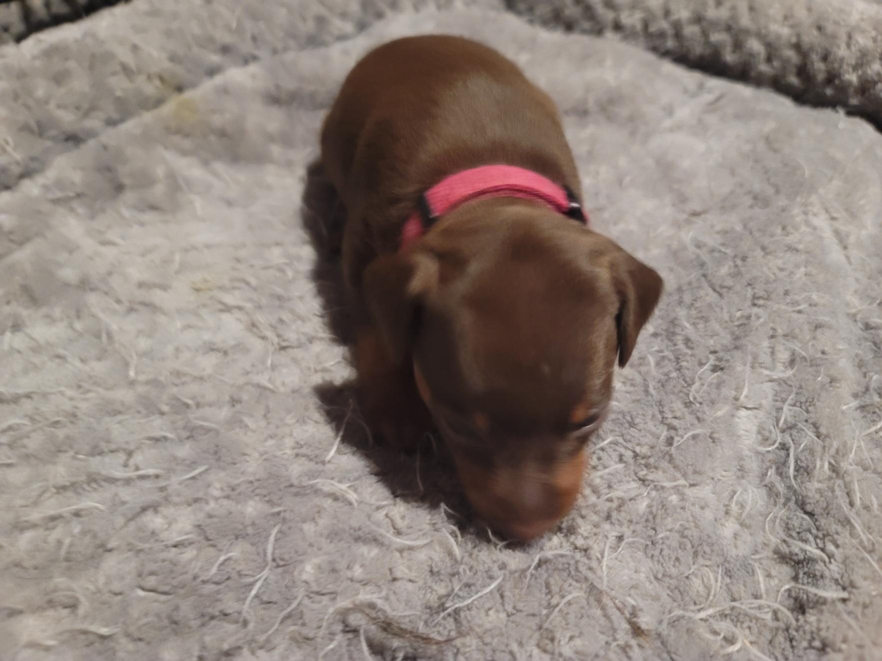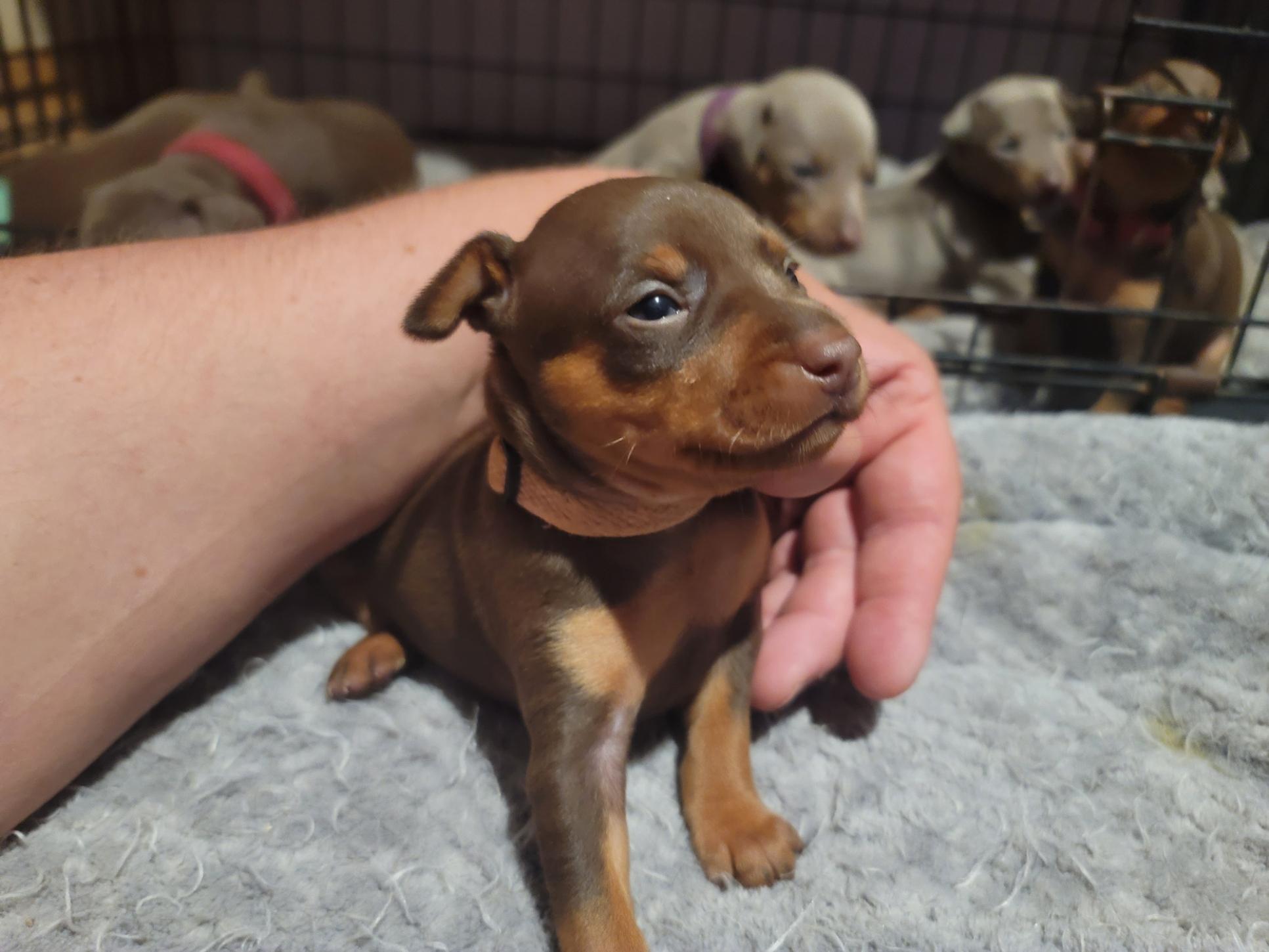 We only breed Miniature Pinschers. No fur baby leave here without a microchip. Go to our Facebook to see more pictures and video's. Puppies leave with a 5 day supply of food, A airline approved travel carrier or backpack, a blanket, 2 popup bowls, pooh dispenser, leash, collar and a cow hoof (we don't use raw hide). Use the Facebook link to our page. For the most up to date pictures and video's.