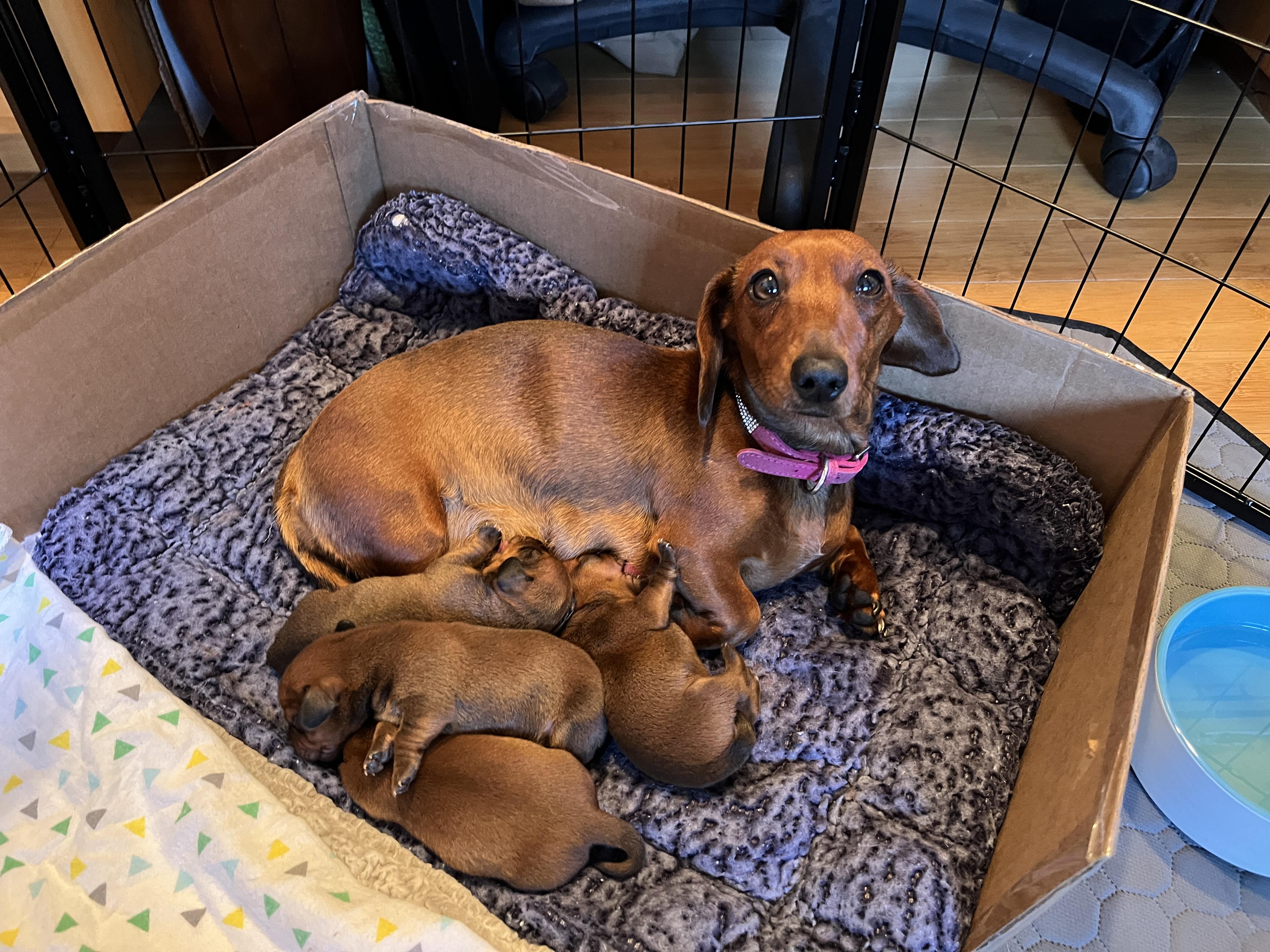 Puppies and Parents are all are raised in my home. I only breed Dachshunds and only the red color with smooth coats. My puppies are all vet checked, vaccinated, dewormed, microchipped and socialized before they go home.