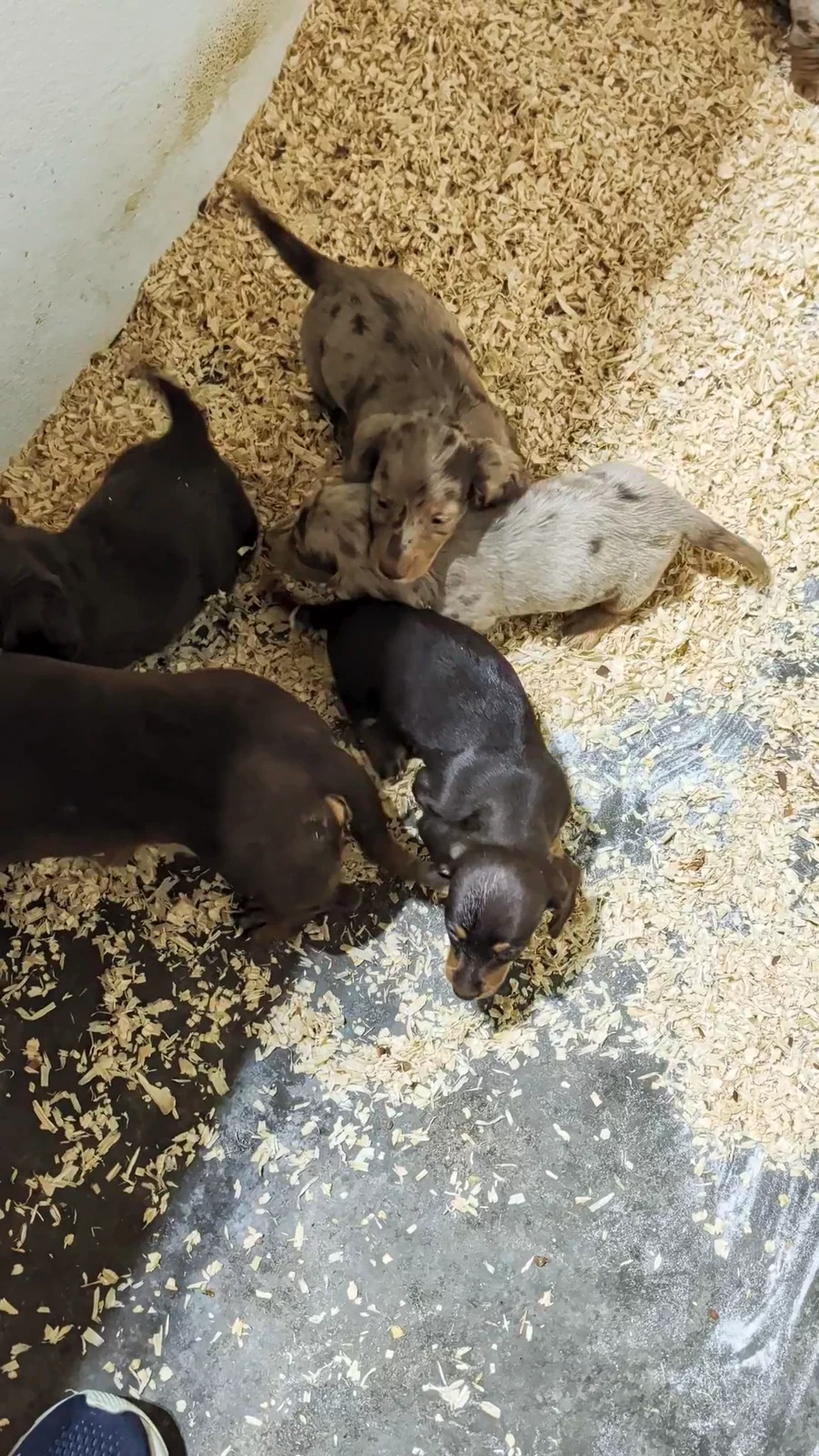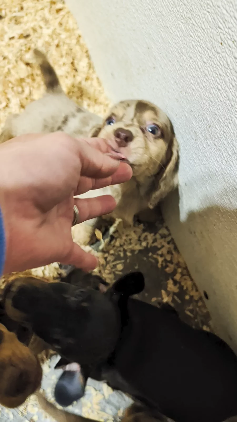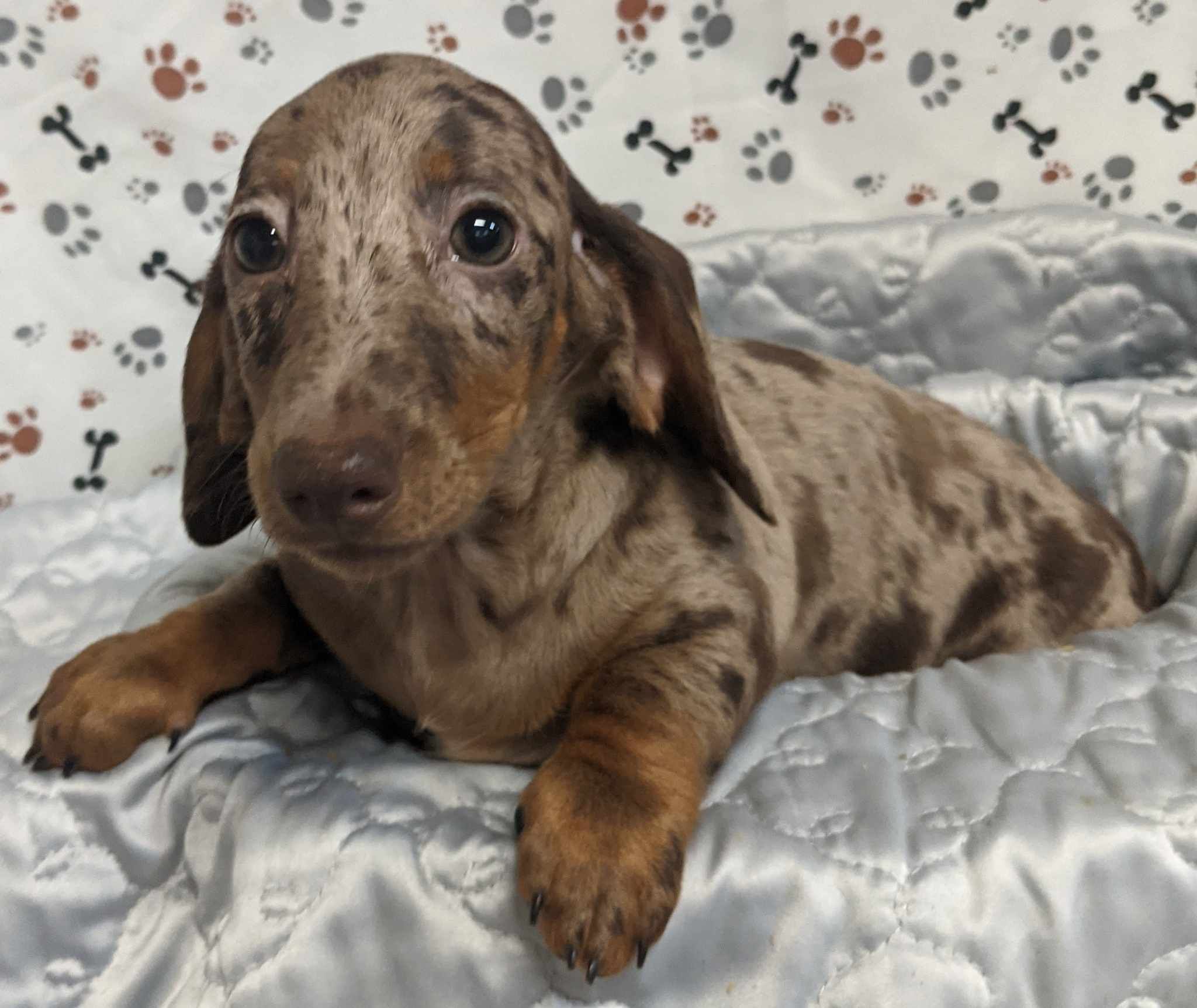 Our puppies include fawn (isabella) and tan, chocolate and tan, blue and tan, black and tan, and dapple. Colors will vary depending on the parent dogs.