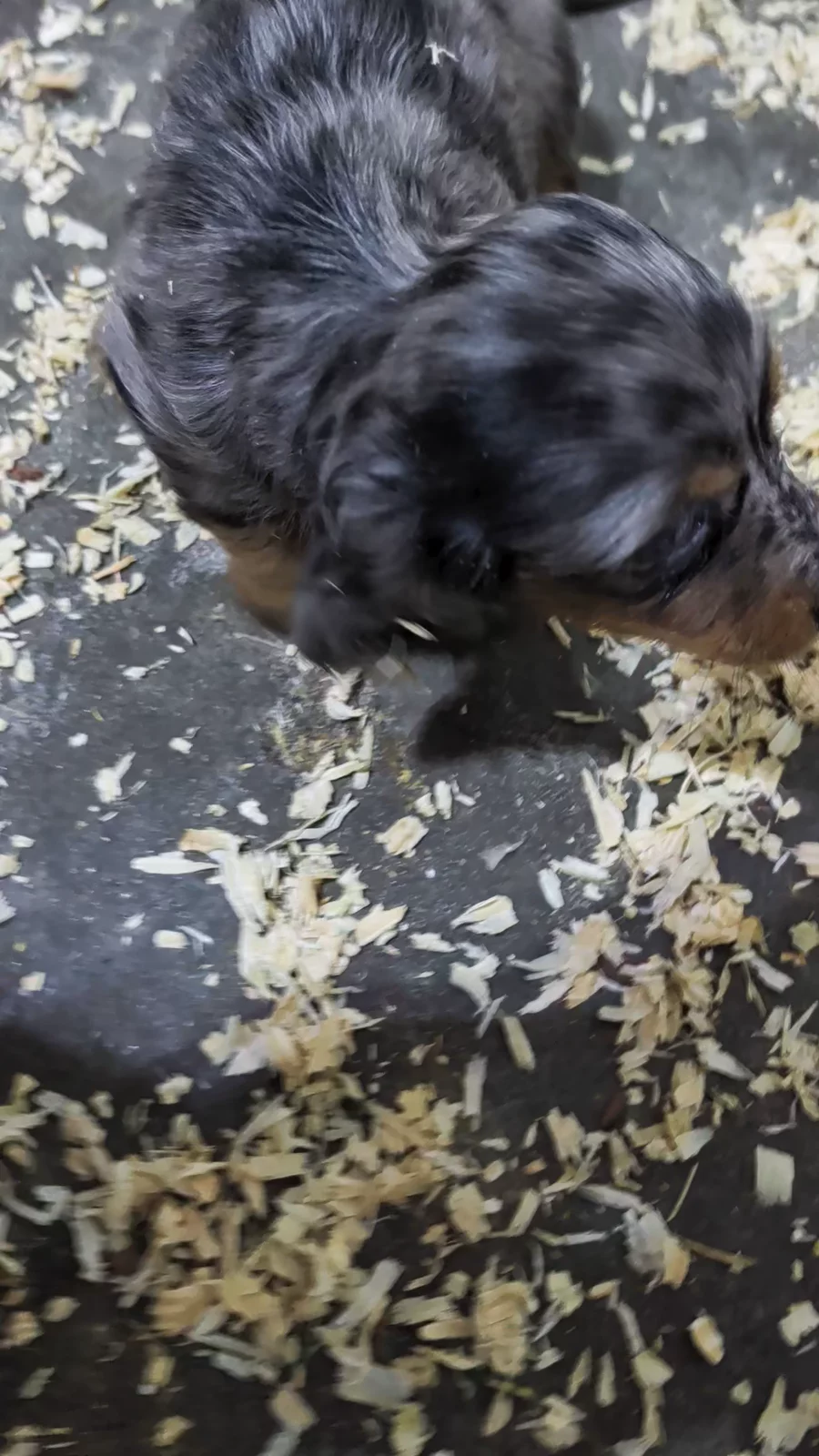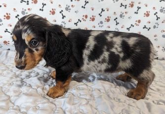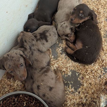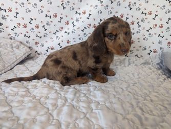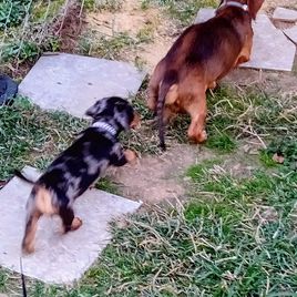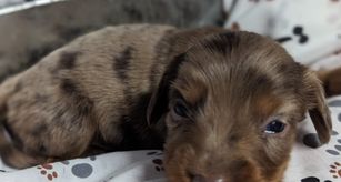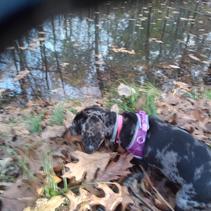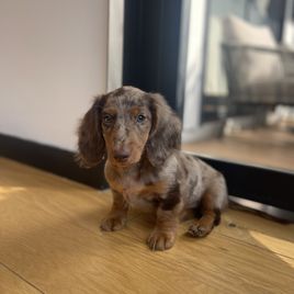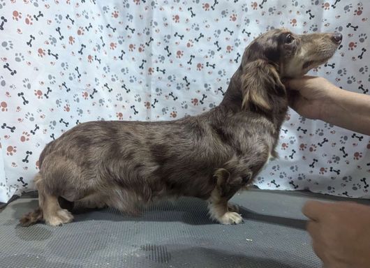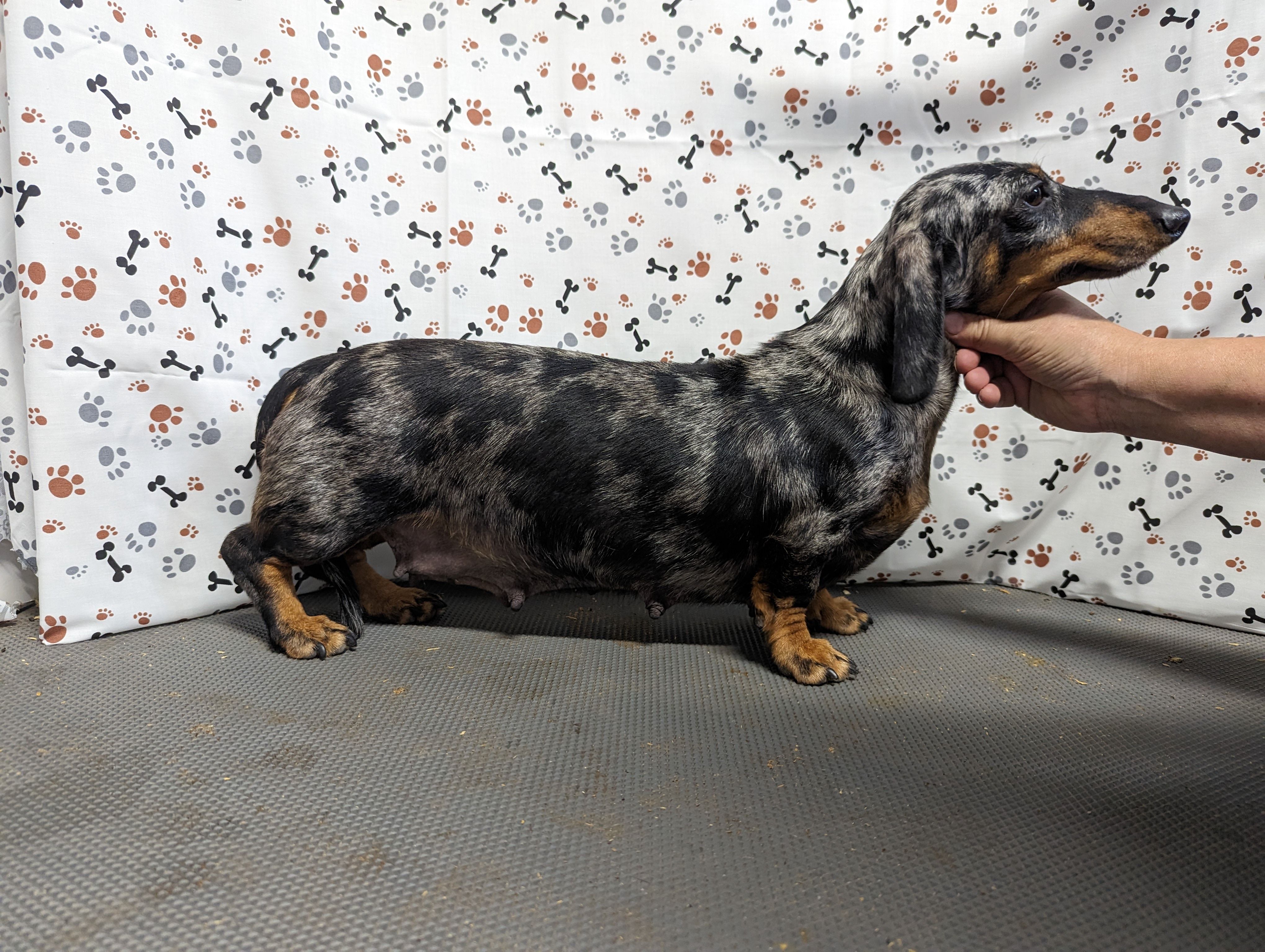 Namaari is out of two AKC Champions. She is a Smooth, Dapple, Miniature Dachshund. She is registered with AKC. She has a very loving personality and loves attention. Always wants to be pet. She is an experienced Dam.