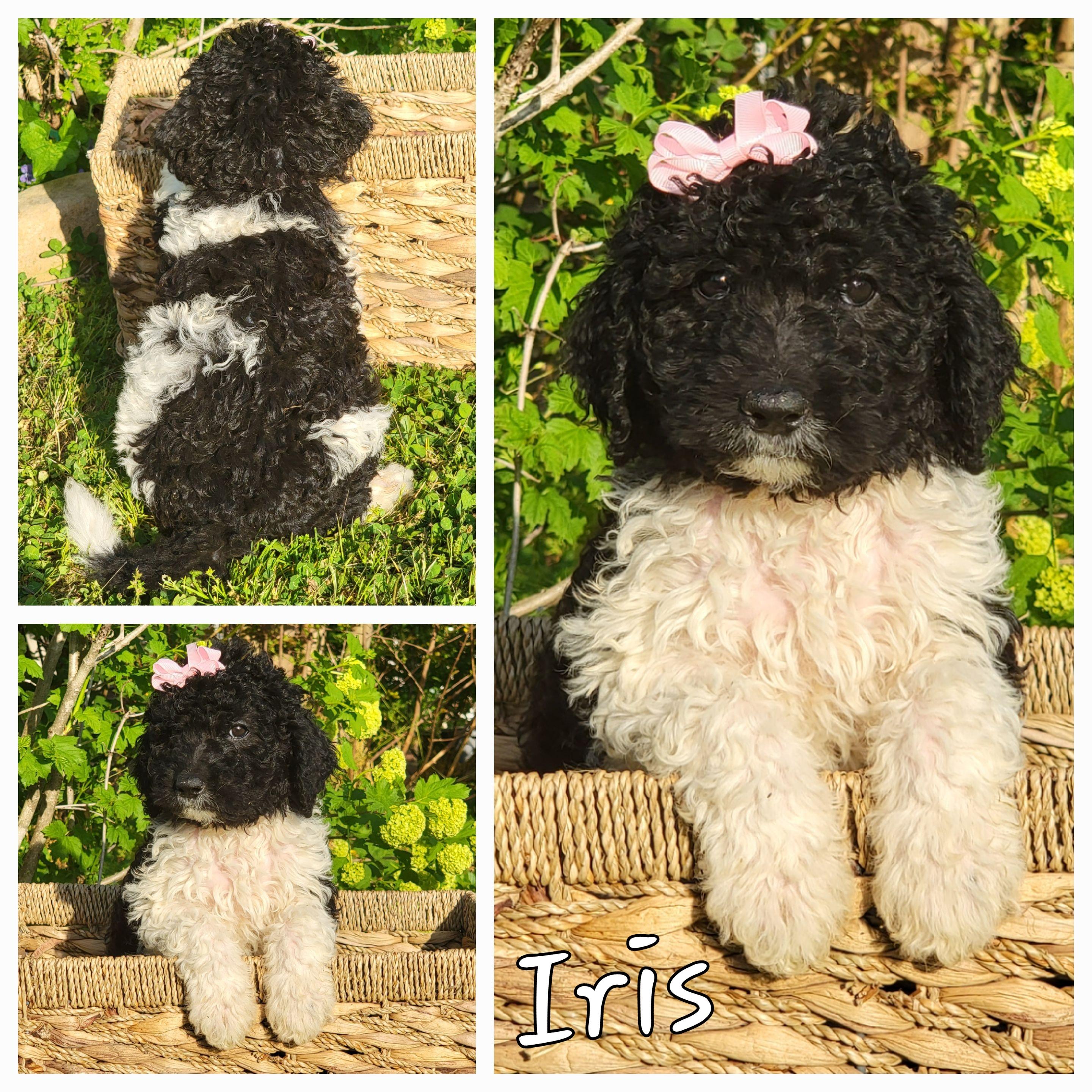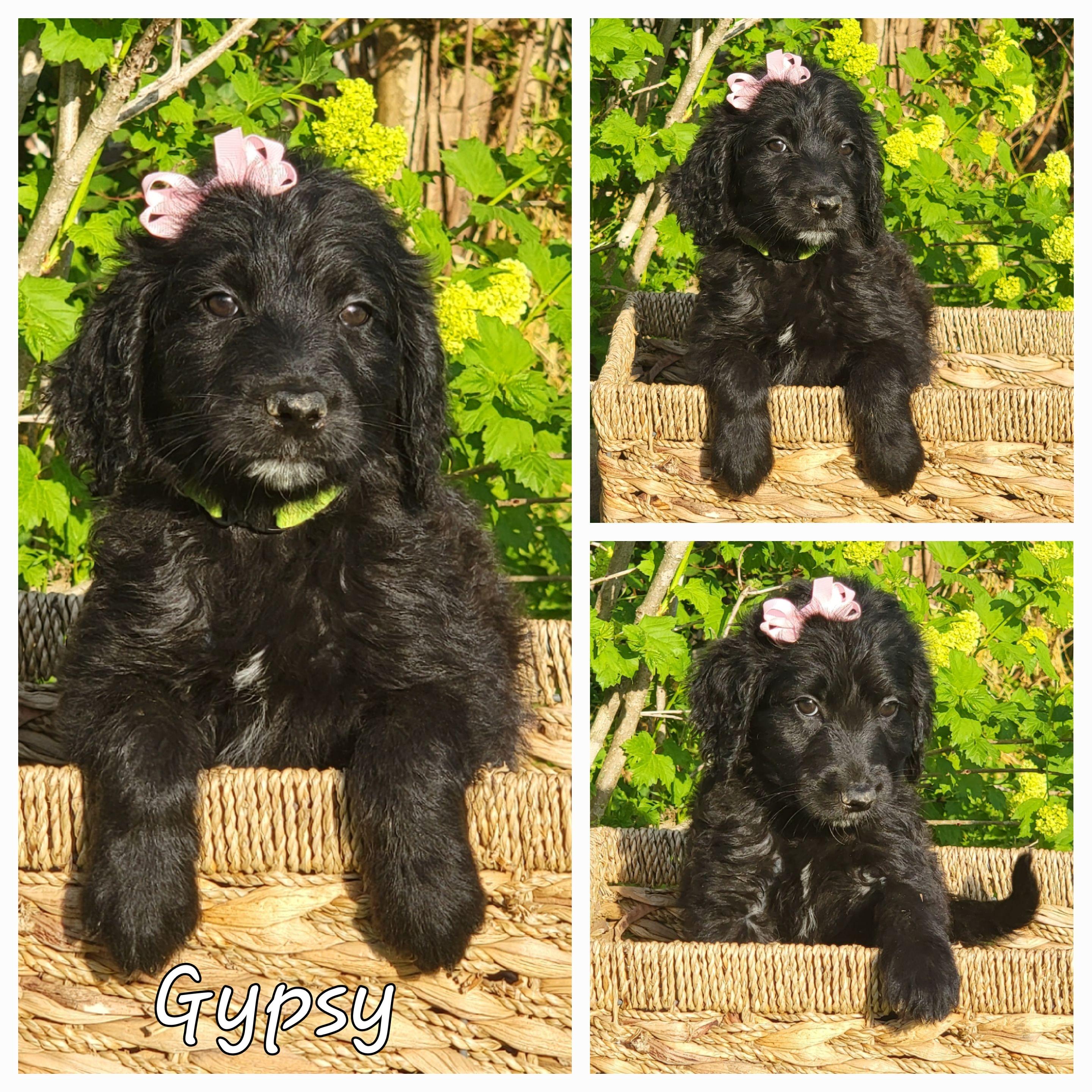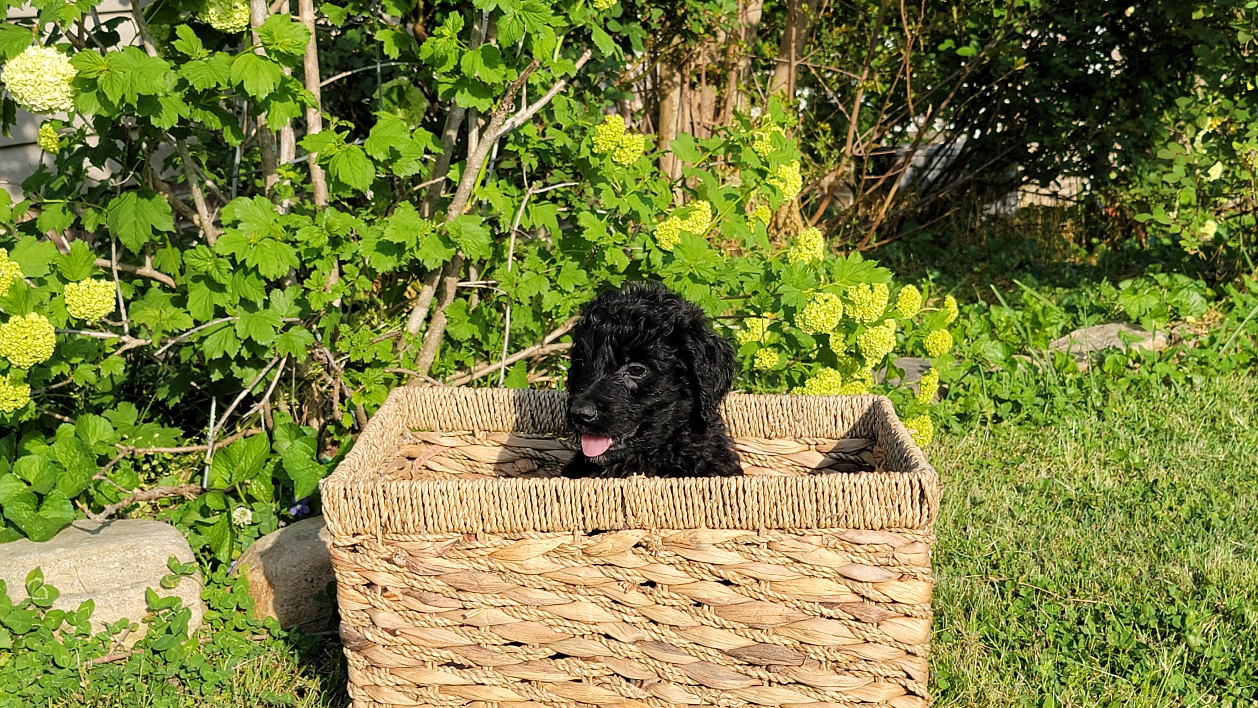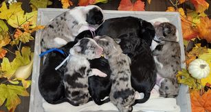 Poodle puppies include black, cream, and phantom. Aussiedoodle puppies include blue merle, red merle, and black and white. Colors will vary depending on the parent dogs.