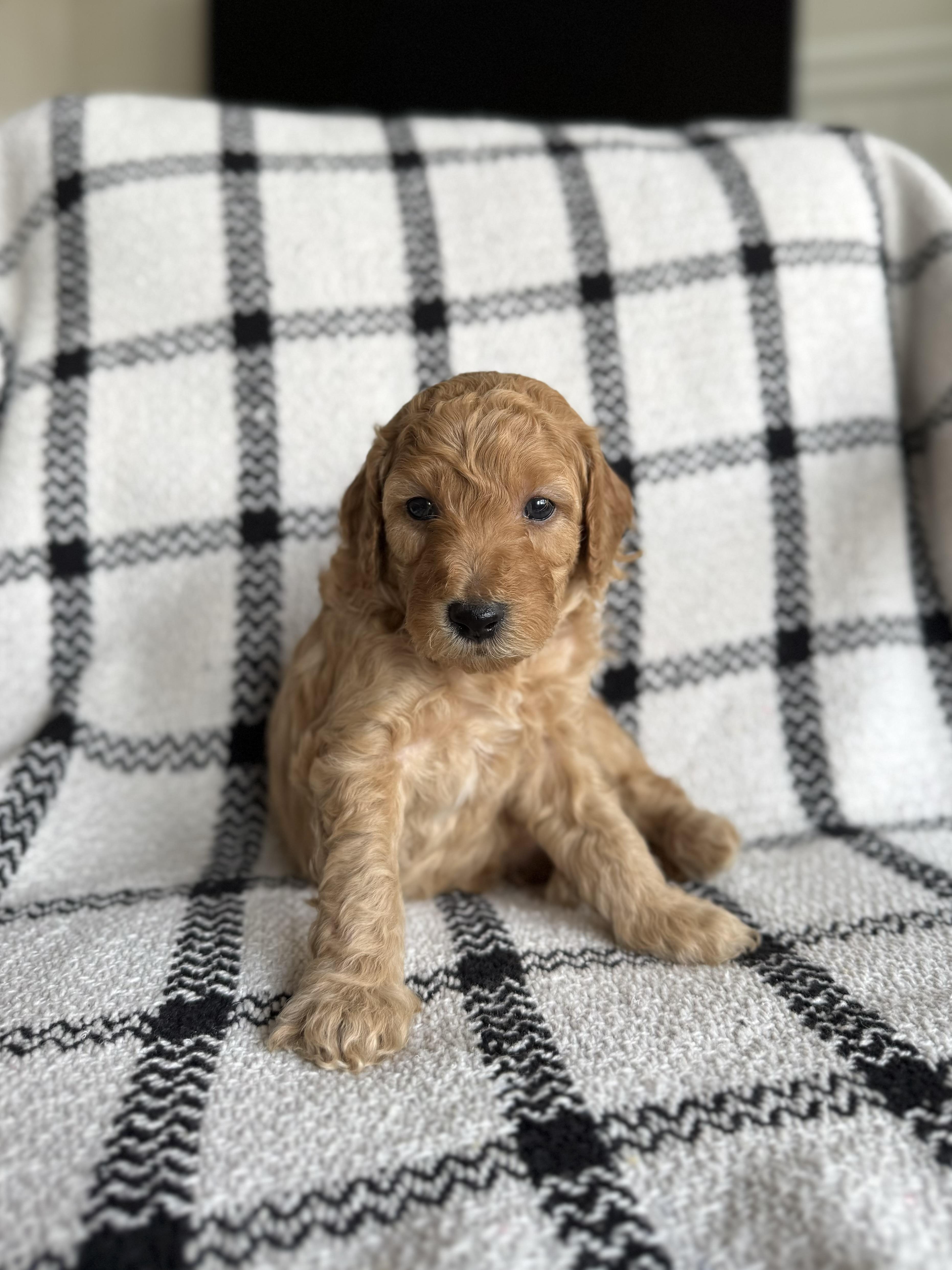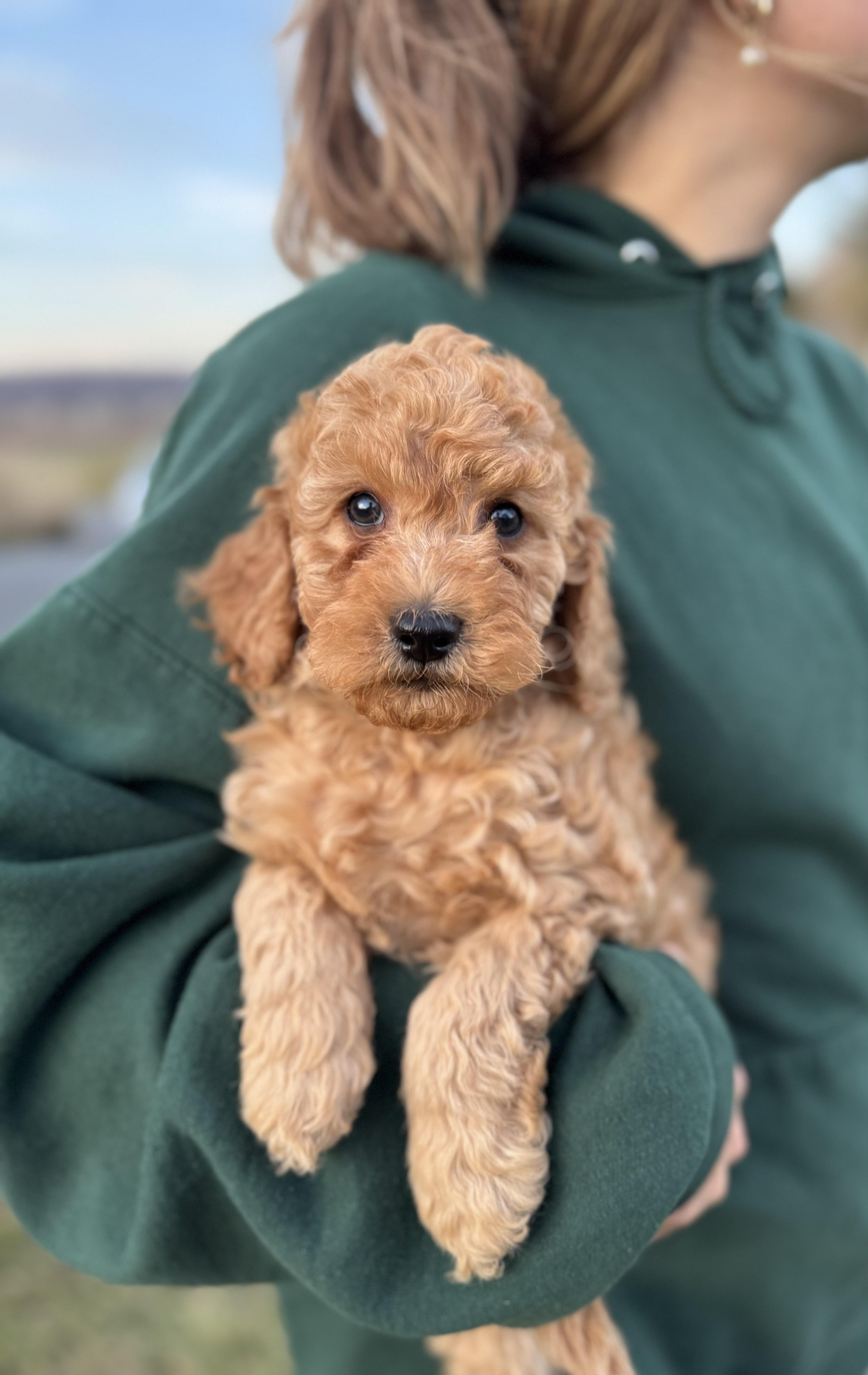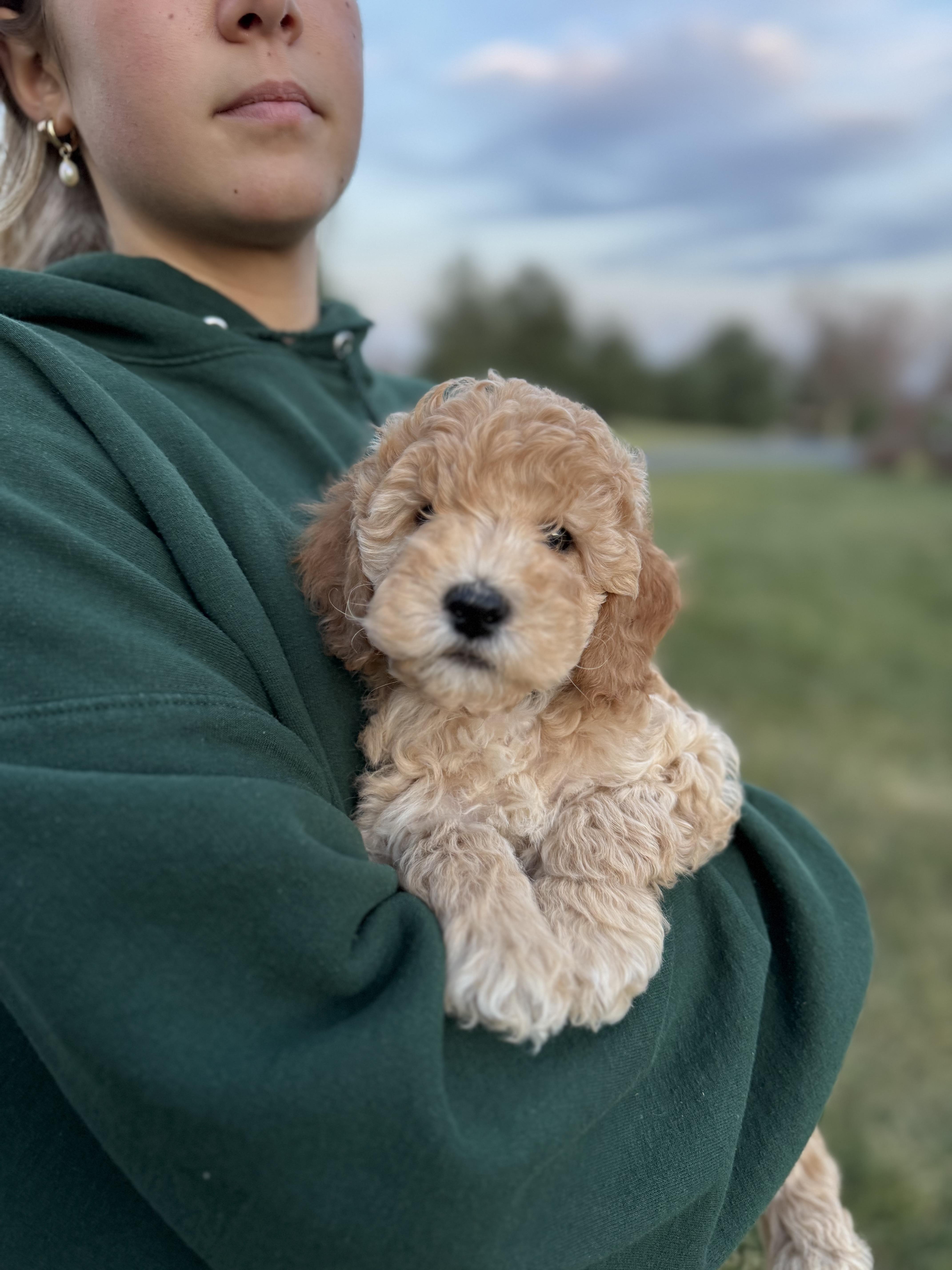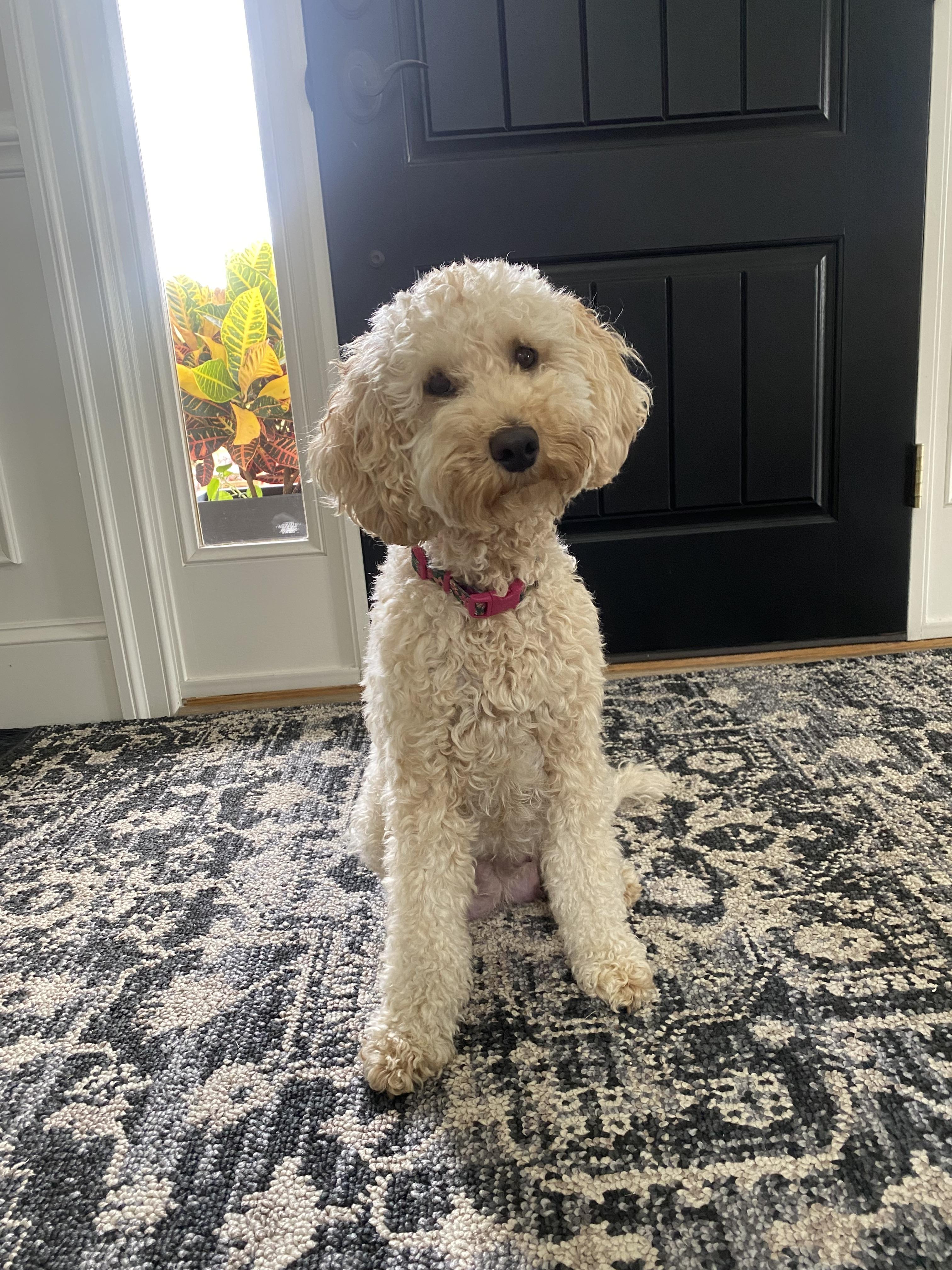 Kona is a very sweet and social miniature labradoodle. She has a curly caramel coat and never lets down the opportunity to play catch. She is in-home raised and loves being around children, adults, and other dogs!