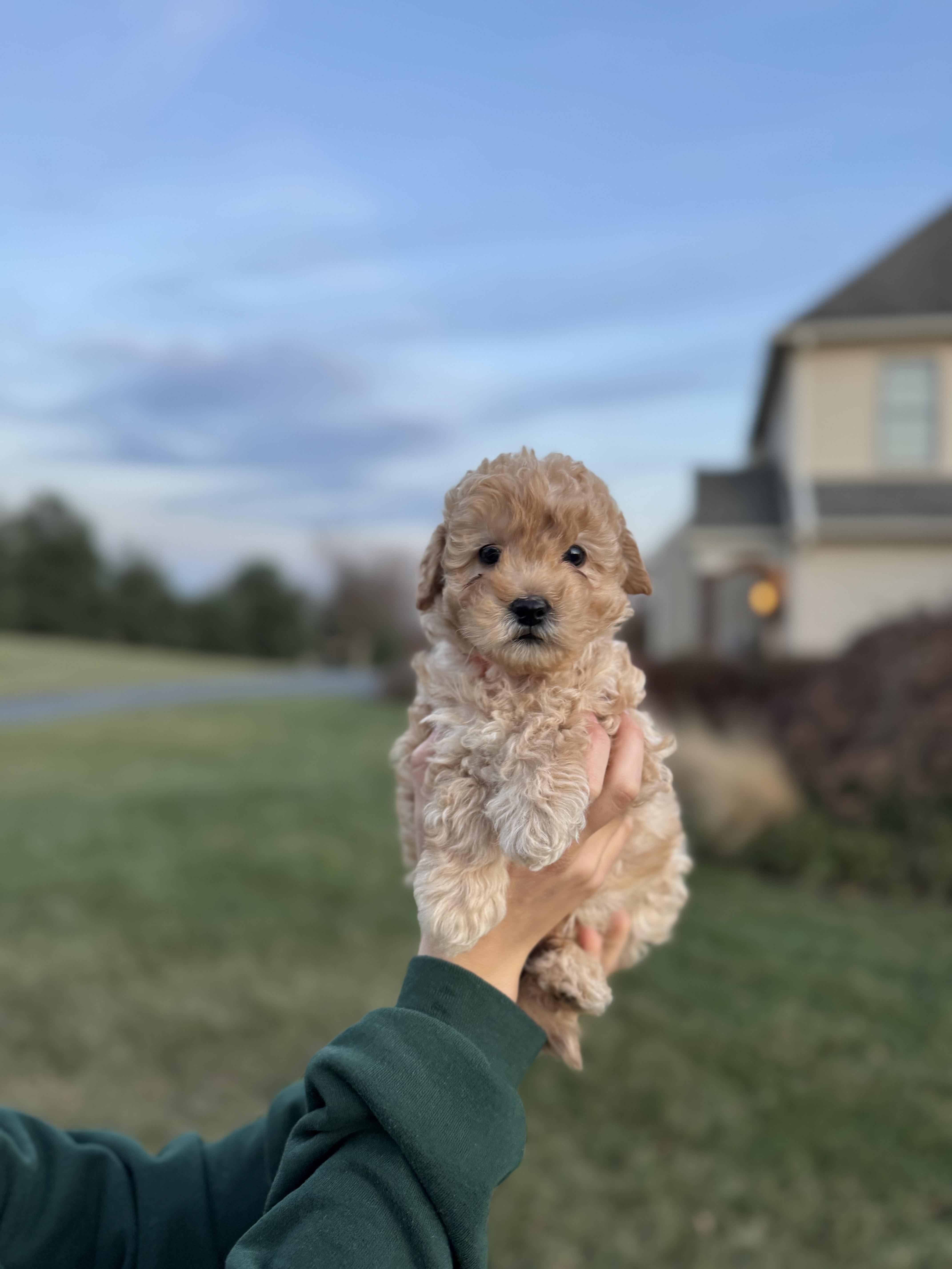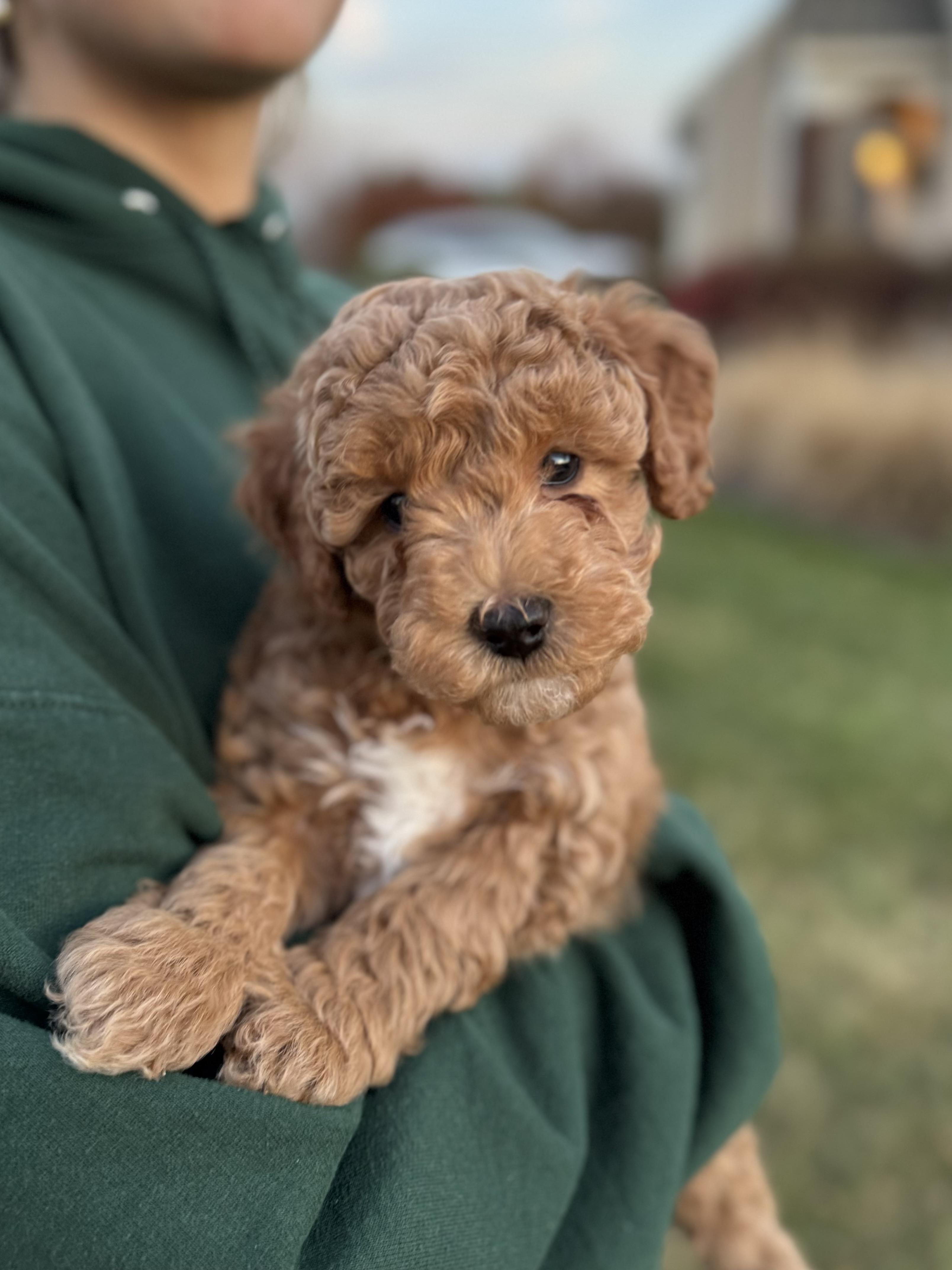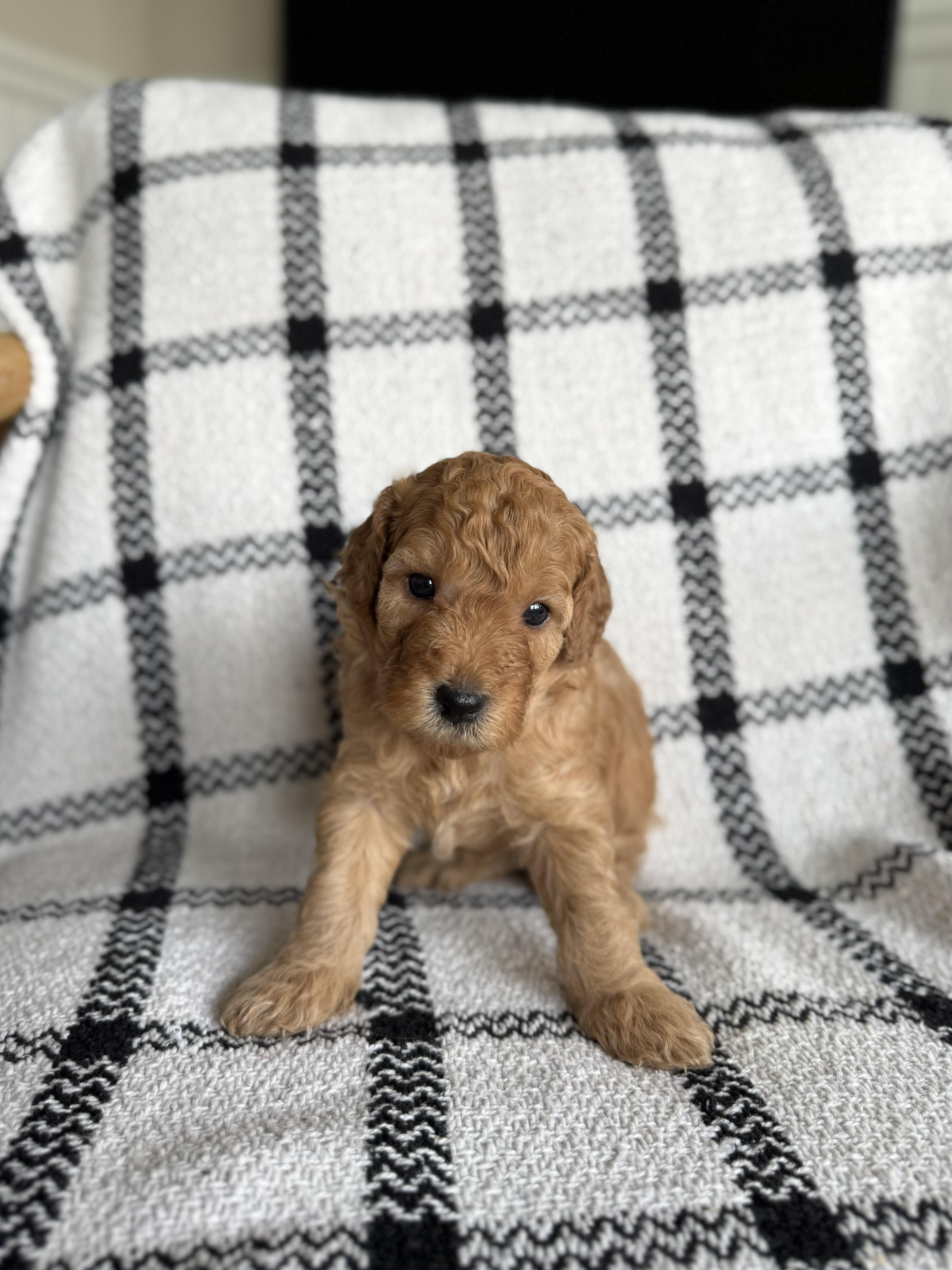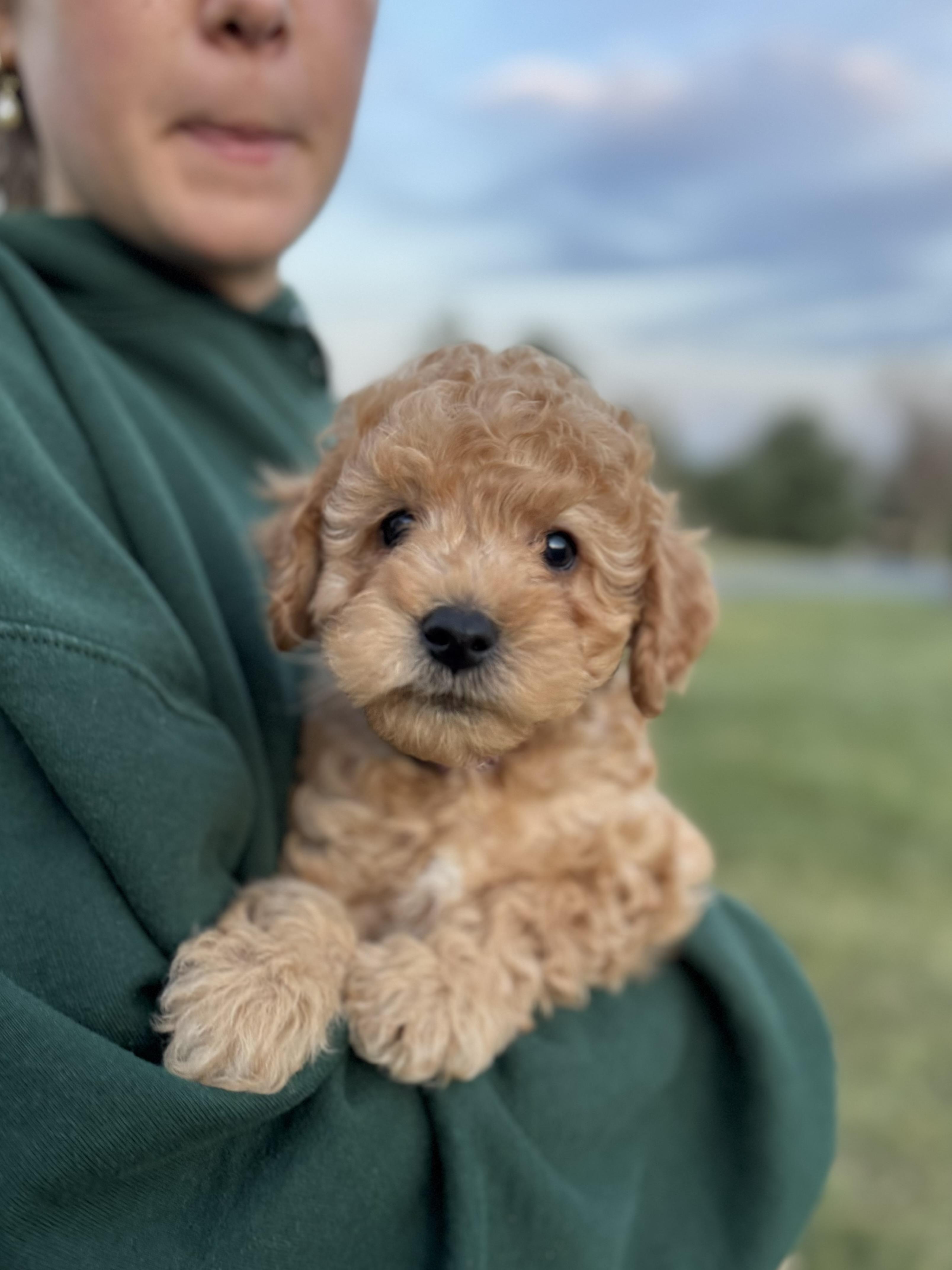 Kona is a very sweet and social miniature labradoodle. She has a curly caramel coat and never lets down the opportunity to play catch. She is in-home raised and loves being around children, adults, and other dogs!