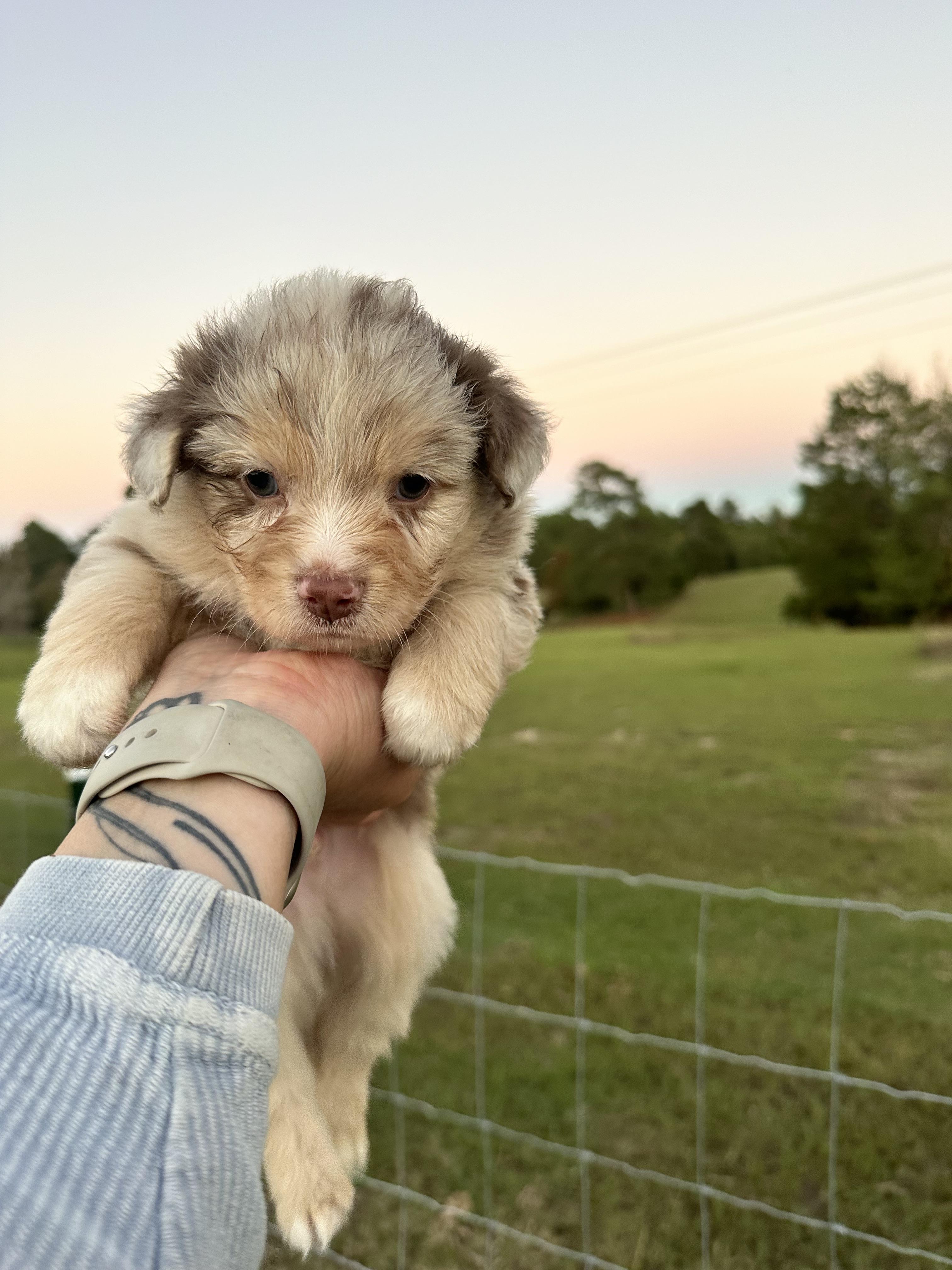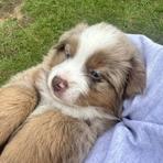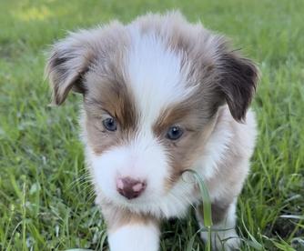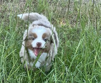 Introducing our spirited red merle miniature Australian Shepherd, Reba! She is a true character, with a stunning coat of swirling reds and browns, complemented by striking white markings. Her bright, expressive blue/brown eyes radiate curiosity and mischief, hinting at the playful personality within. Full of energy and spunk, this little dynamo loves to explore and engage with the world around them. Whether they're racing through the yard or playfully barking to get your attention, she is always ready to make their presence known.