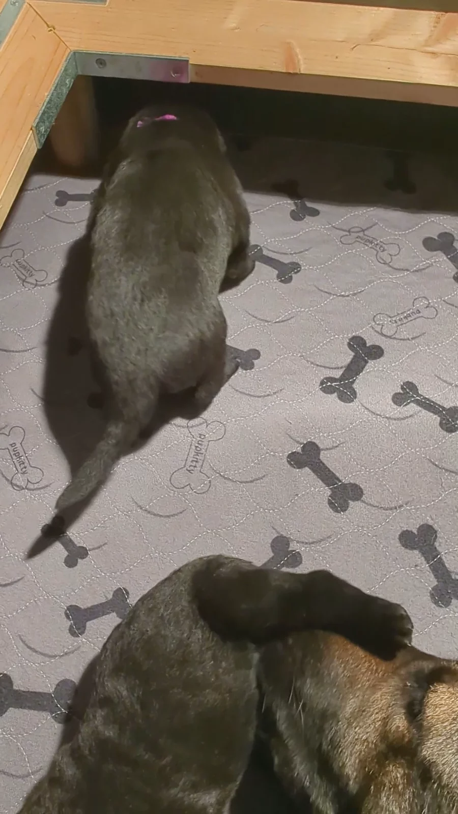 They're all growing so fast. Eyes are open, ears opening, walking on all 4 feet, and making tons of barking noises! Now the fun begins! BTW, lime green is now Orange collar.