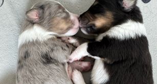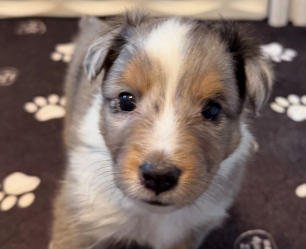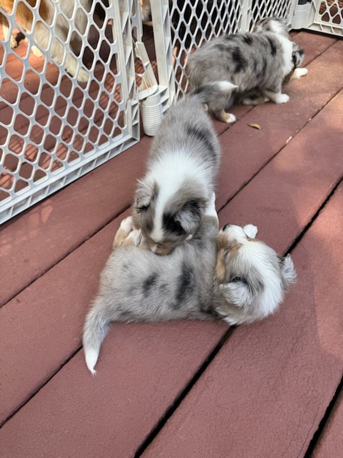 Our puppies include black white and tan and blue merle white and tan. Colors will vary depending on the parent dogs.