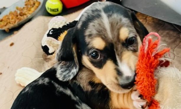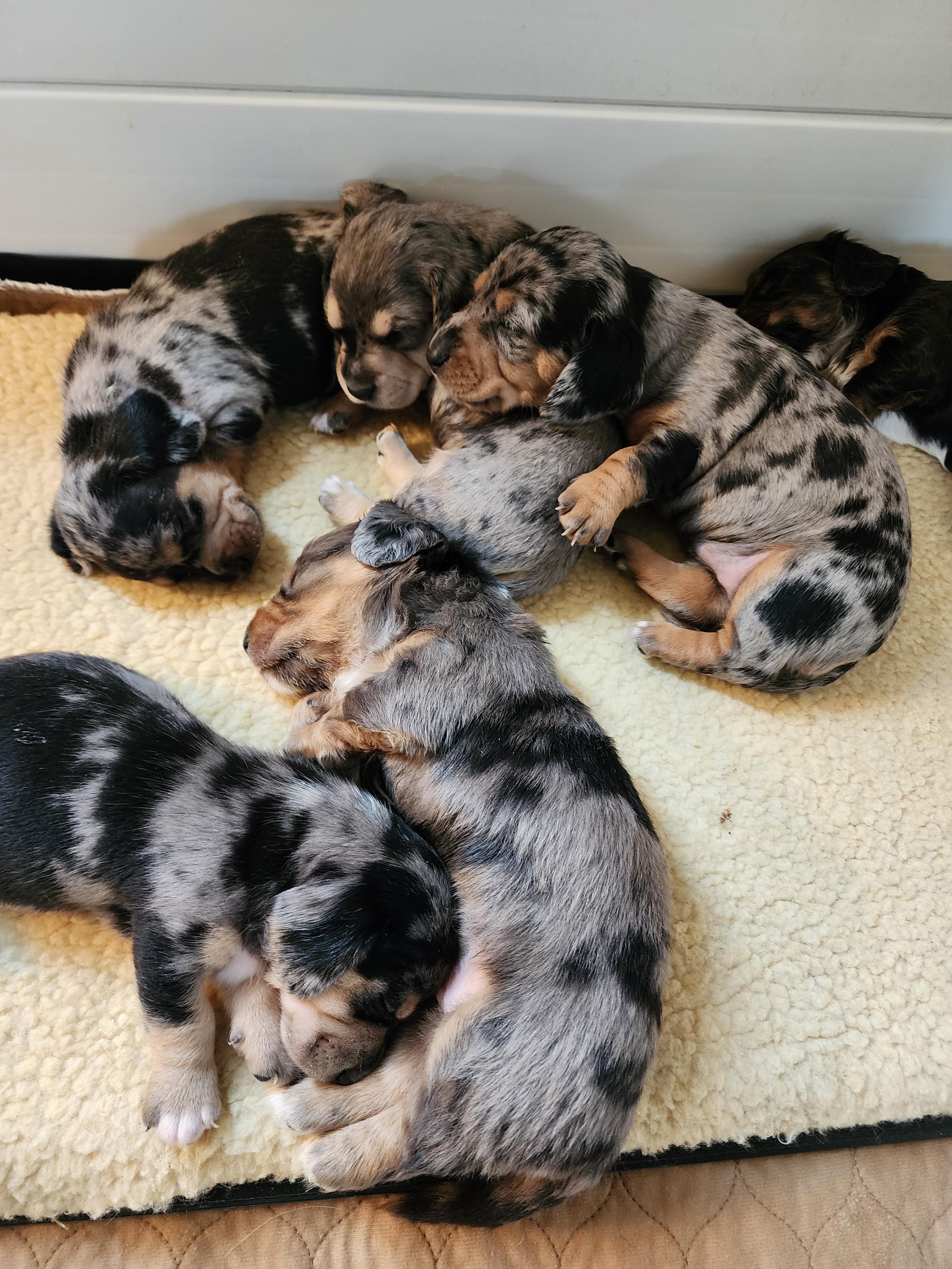 Our puppies include red, blue and cream, blue and tan, black and cream, black and tan, and dapple. Colors will vary depending on the parent dogs.