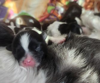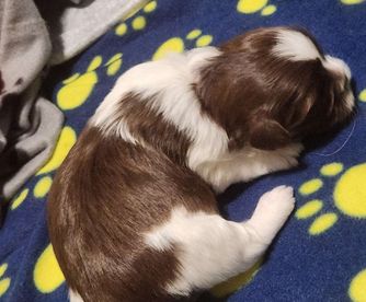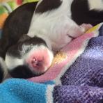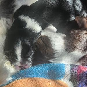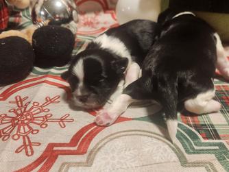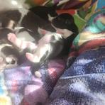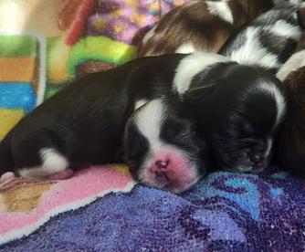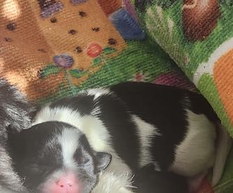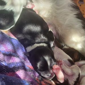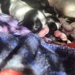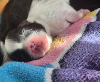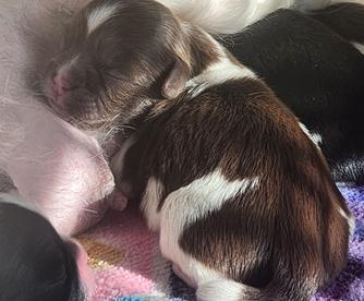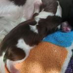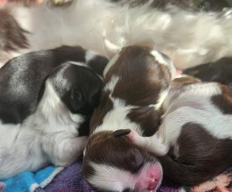 Our puppies include liver and white, brindle and white, and black and white. Colors will vary depending on the parent dogs.