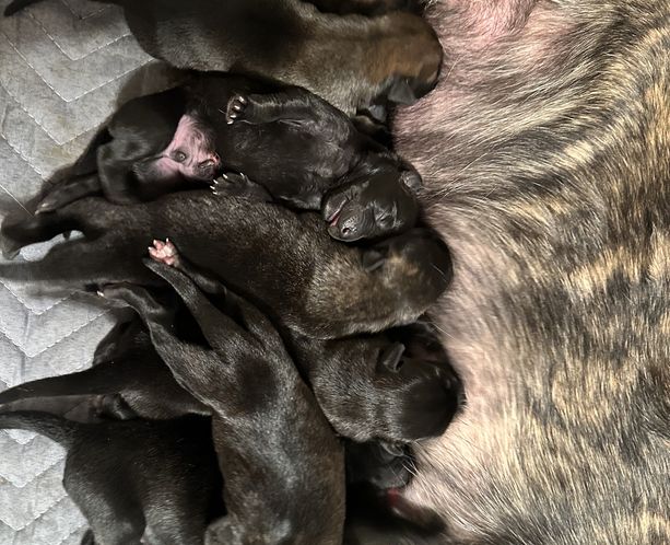 Our puppies are black brindle. Colors will vary depending on the parent dogs.