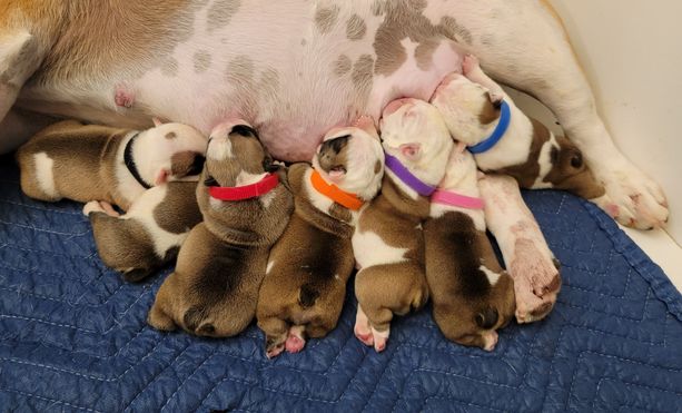 Our puppies include blue tri-color, black tri-color, red, fawn, white, brindle, red brindle and white, red brindle, red and white, fawn and white, fawn brindle and white, and fawn and brindle. Colors will vary depending on the parent dogs.