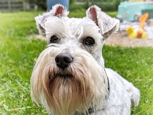 Kevin is a very outgoing spunky little guy! He was our first schnauzer. He loves just about everything and everyone. Summer days in the yard are his favorite but he also enjoys to snuggle up on the couch at the end of the day. He is just an amazing dog.