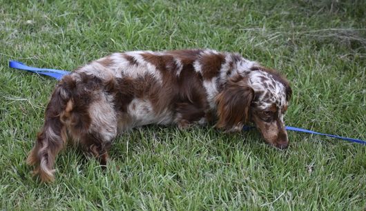 Maggie is a female Dachshund. Carefully selected as a great representative of her breed, Leah decided to make her part of their program. Leah has passed Good Dog’s screening process, which involved a review of their breeding practices, environment, and the mental and physical health of their dogs.