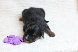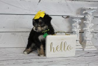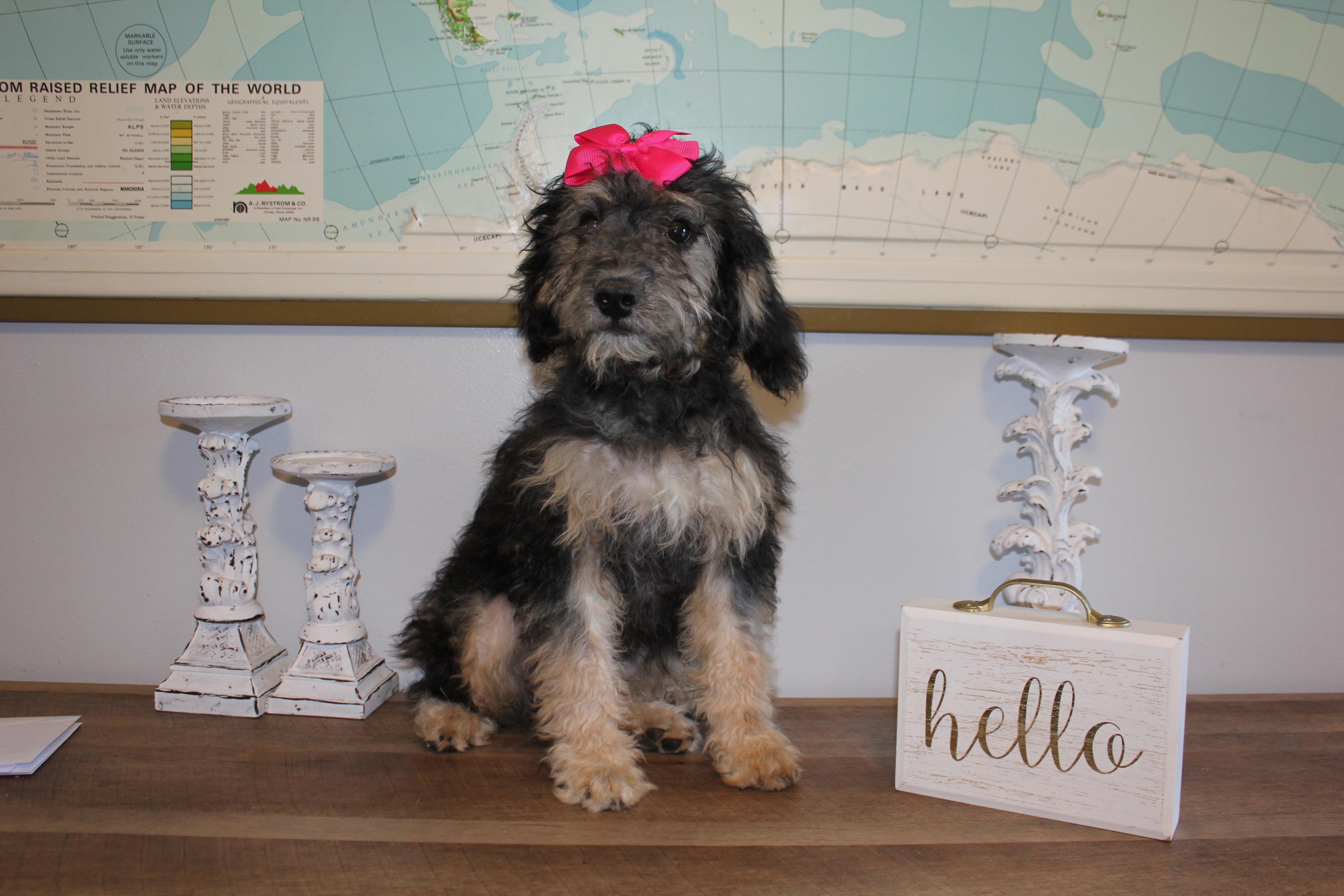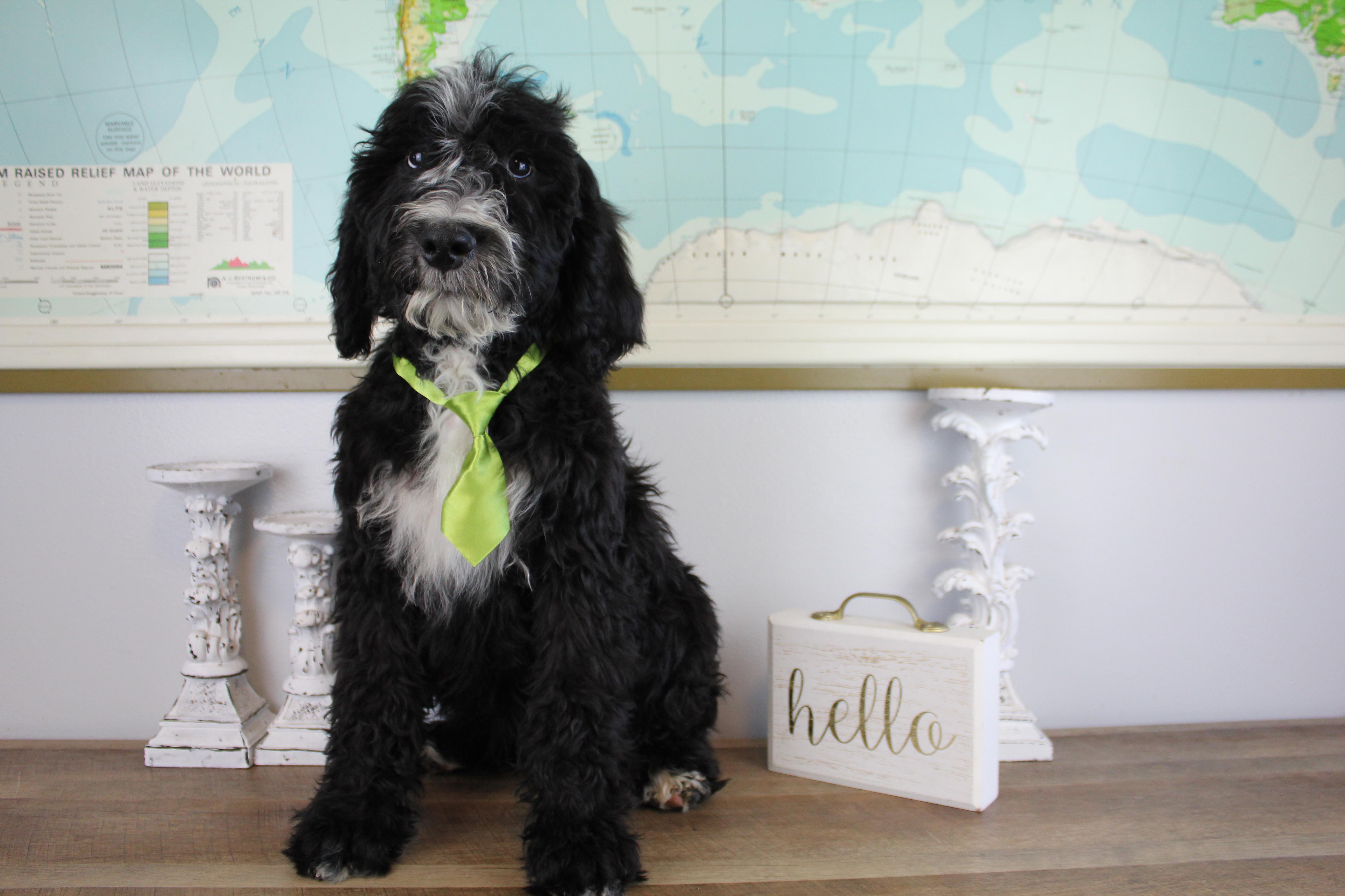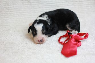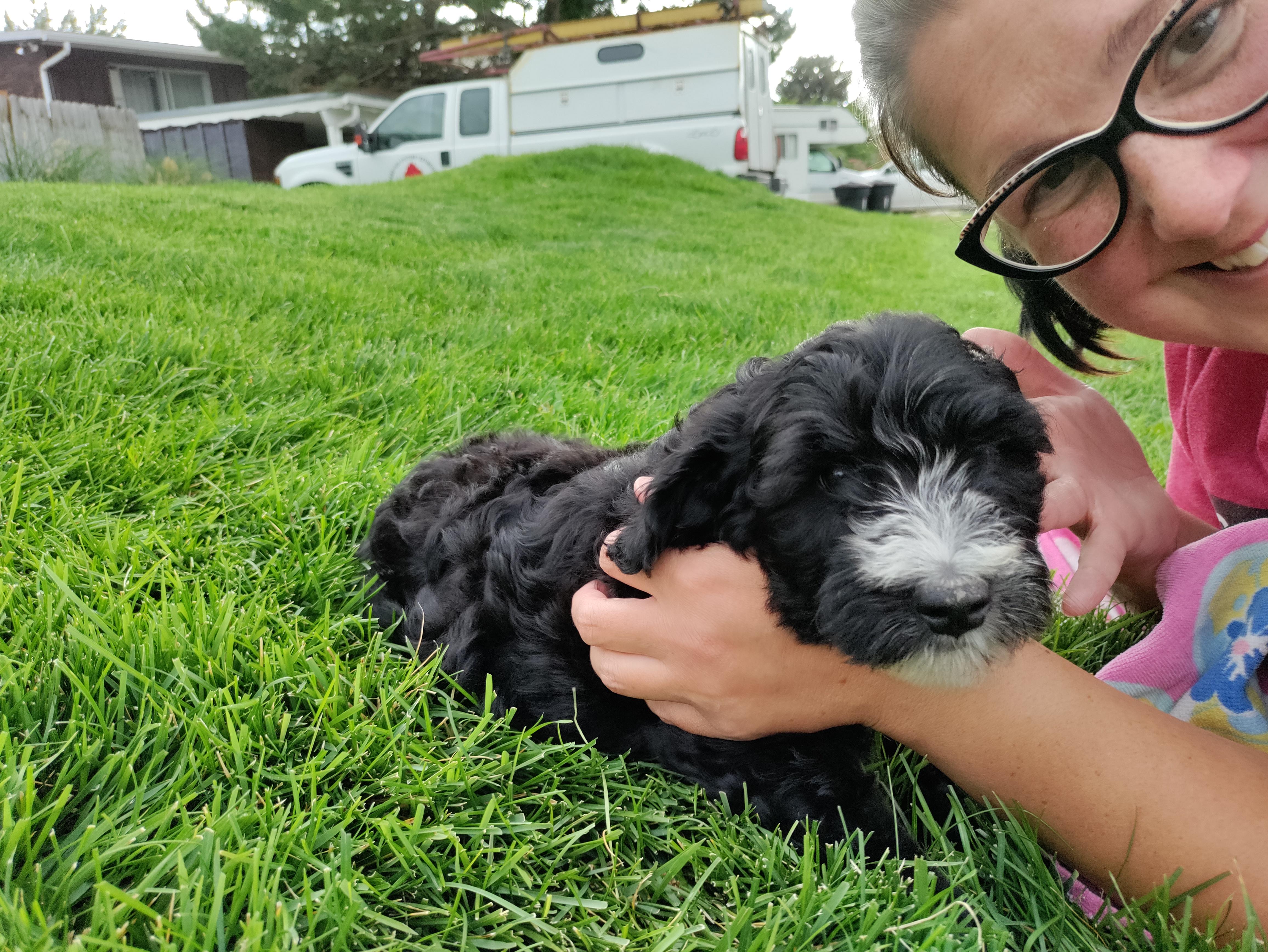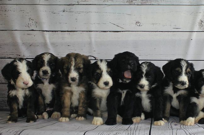 Our Aussiedoodle puppies include black and white and black tri-color. Colors will vary depending on the parent dogs.