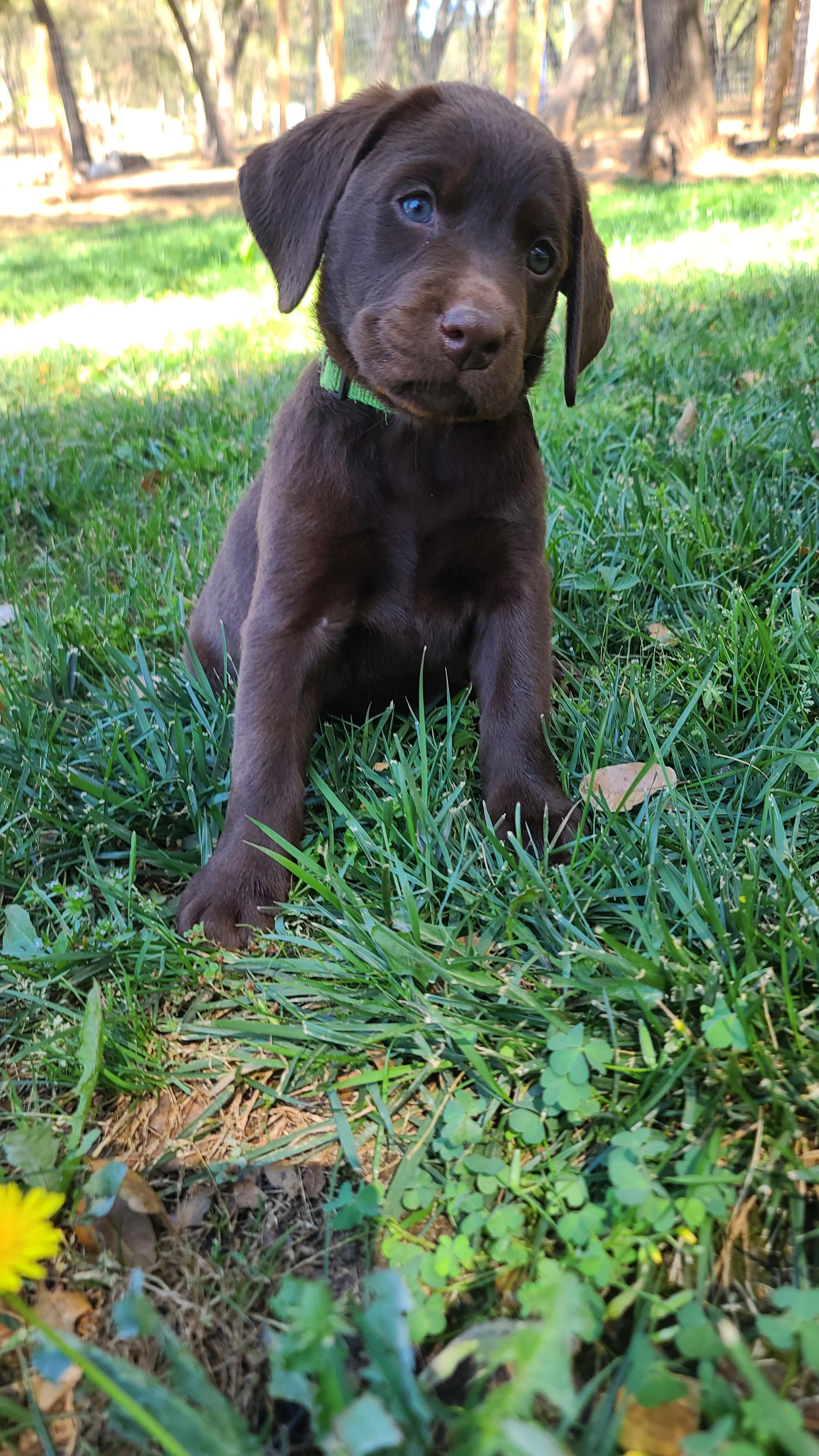 Hi there, my name is River! I am a very smart boy who loves to play fetch, go to the dog park to meet new friends, and wrestle. I am crate trained, house broken, I know all my basic commands, and love to shake paws! I am the only male dog on the farm - it is hard to be surrounded by so many women! I am an American/English Lab with a tall lean body like an American Lab and a big block head like an English Lab. I have all of my vaccines, am dewormed, treated with flea/tick/heartworm medication, and am very healthy with no preexisting issues. I am an 95 pound AKC registered milk chocolate Lab with big hazel eyes. My DNA health check is perfect and I make very healthy puppies! I have been OFA Health Tested for Hips (GOOD) and Elbows (NORMAL) Dysplasia. I am a very big boy but I still think I am a lap dog! Come meet me, my friends, and all my pups on the farm!