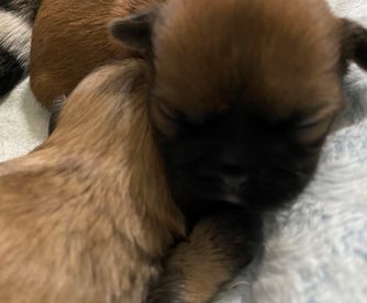 She is a gold with black mask CKC registered female who is so loyal and kind. She and Tramp love each other so much. They often walk side by side and bounce off each other turn around and make a heart shape. They are in love. She is a wonderful mother to her puppies and protects them well. She is small soft fluffy and beautiful.