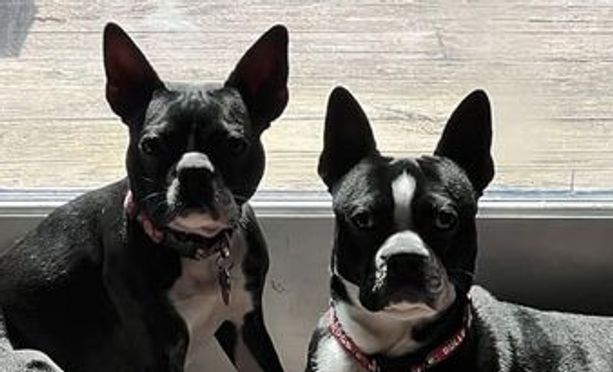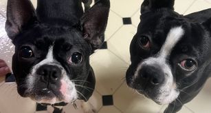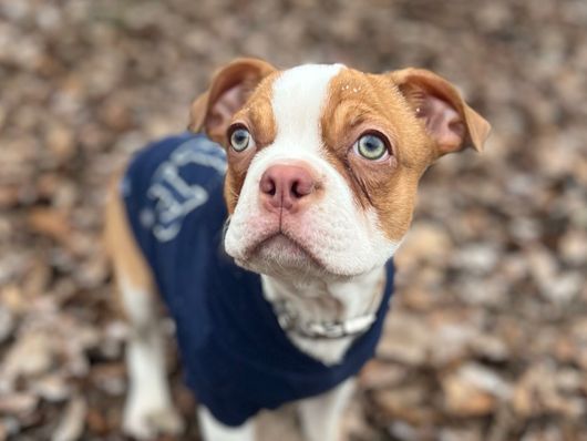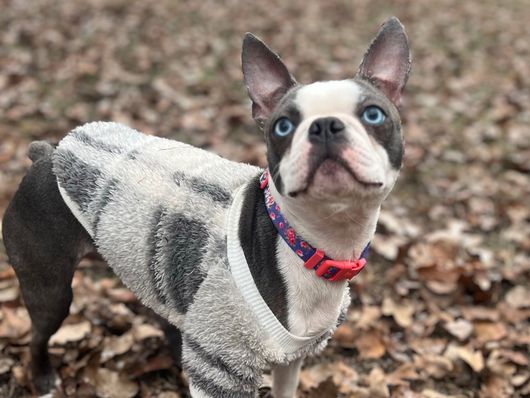 Honor is our blue AKC Boston Terrier. She is smaller at 16 lbs. she is vocal, super sweet, loves to cuddle, and is definitely a princess