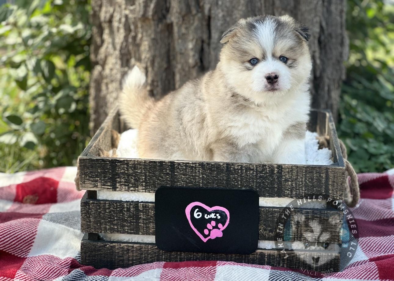 Our sweet girl Emily is 8 weeks old and ready for her forever home! She’s charting to be around 20–25 lbs full grown—perfect for someone looking for a smaller Pomsky with a big personality. ✨