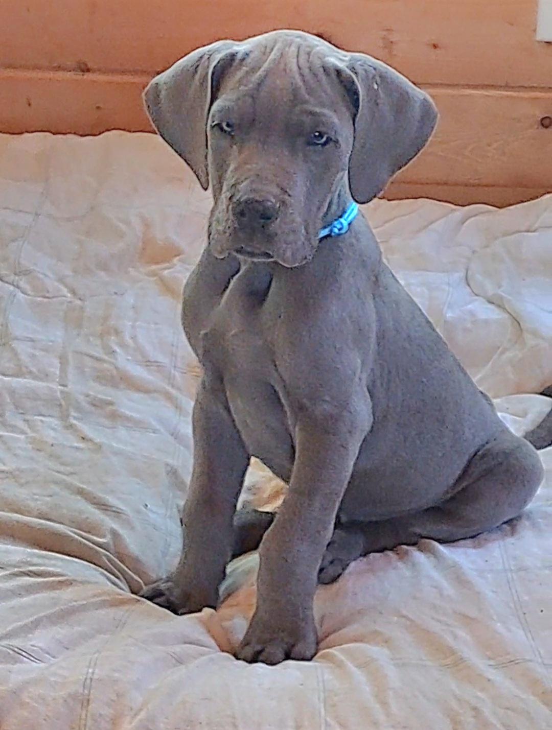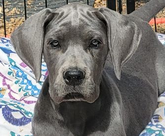 Ellie is a solid blue Dane with beautiful golden color eyes. She is very athletic! Love to play them snuggle by a fire. Her confirmation is top of the line and very balanced.
